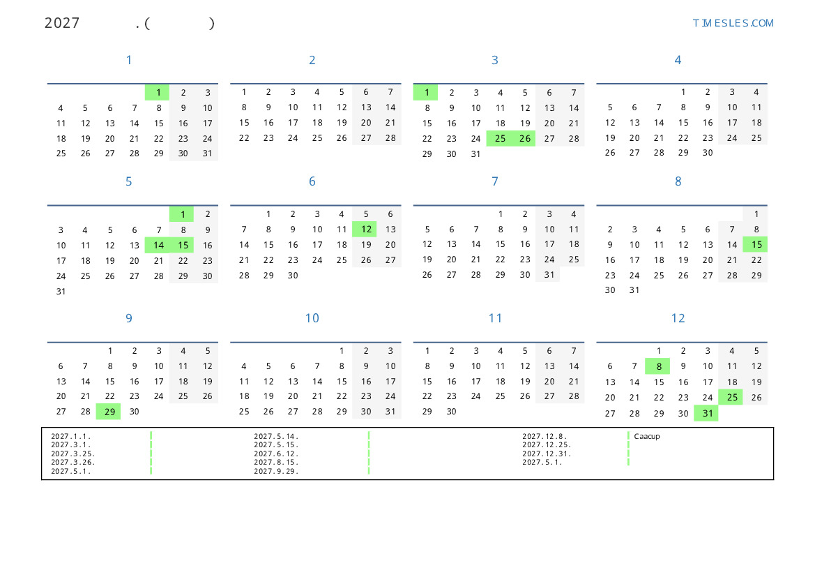 그레고리 안, 윤년이 아니다, 1 년에 365 일. 2027년 파라과이 21 공휴일 및 휴무 있습니다. 중국 동부 달력에서 2027 년은 양의 해입니다. 연도는 금요일에 시작하여 금요일에 끝납니다.