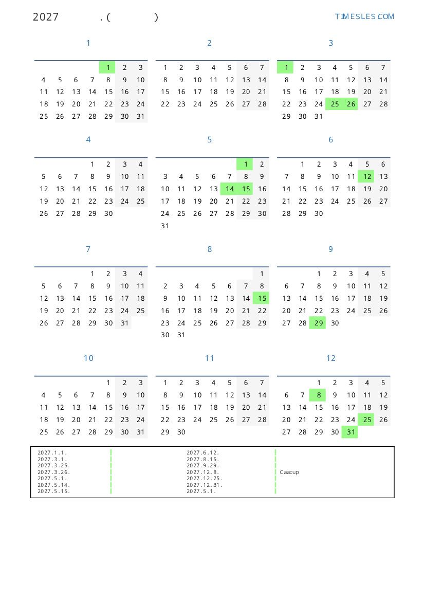 파라과이 2027 년 공휴일 및 주말이 포함 된 PDF 캘린더 다운로드 및 인쇄