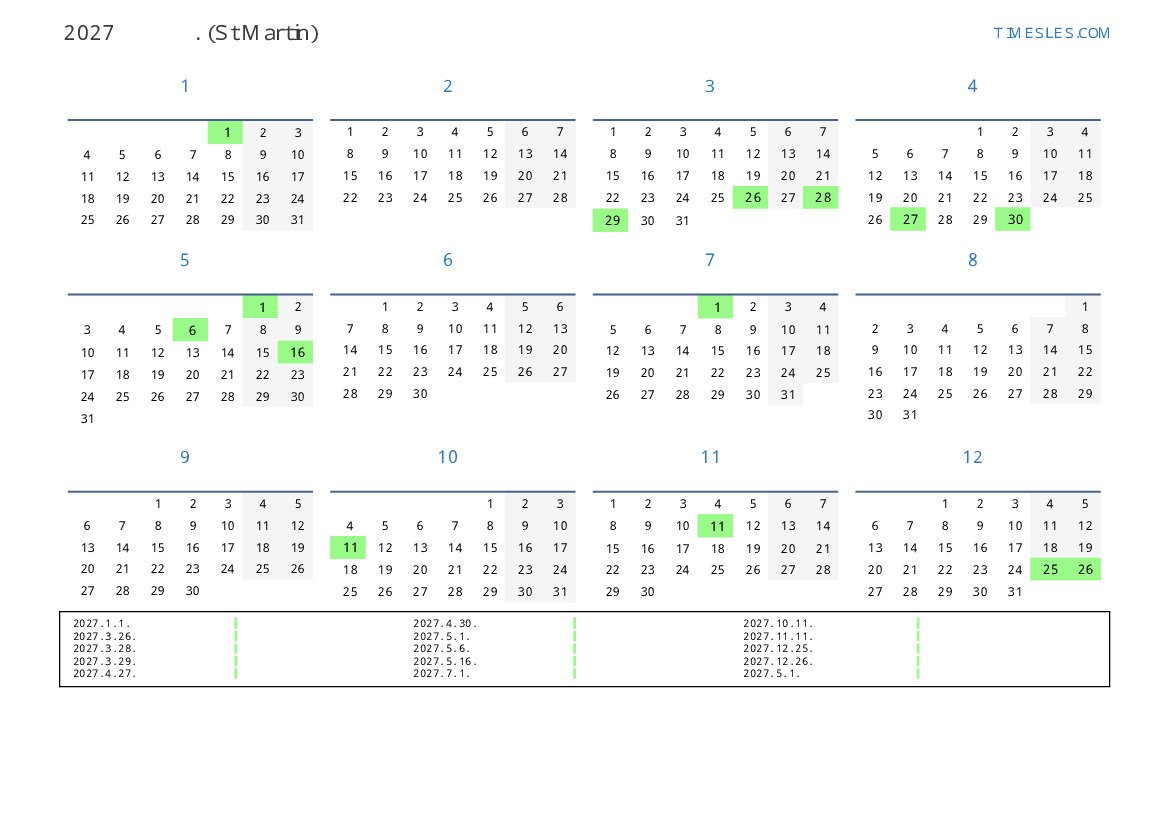 신트 마르 턴 2027 년 공휴일 및 주말이 포함 된 PDF 캘린더 다운로드 및 인쇄