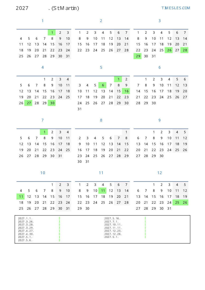 신트 마르 턴 의 2027 년 공휴일 및 주말 달력
