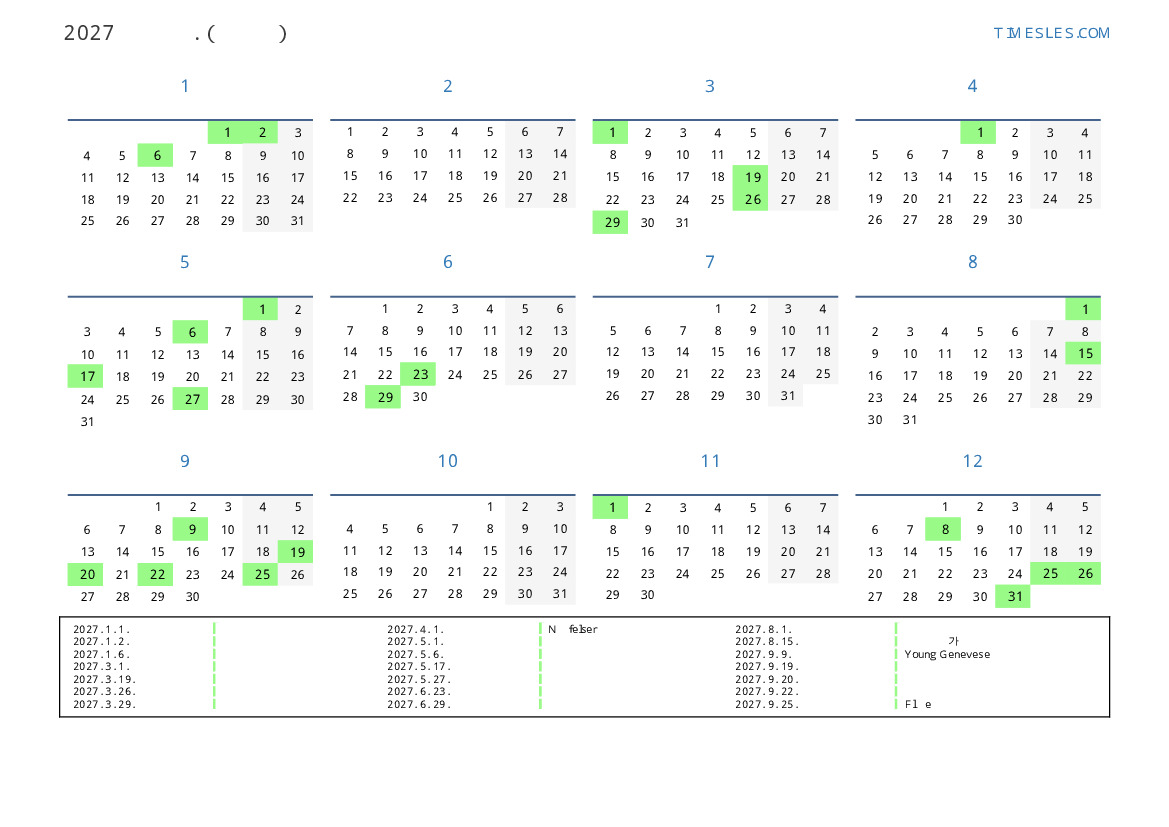 스위스 2027 년 공휴일 및 주말이 포함 된 PDF 캘린더 다운로드 및 인쇄