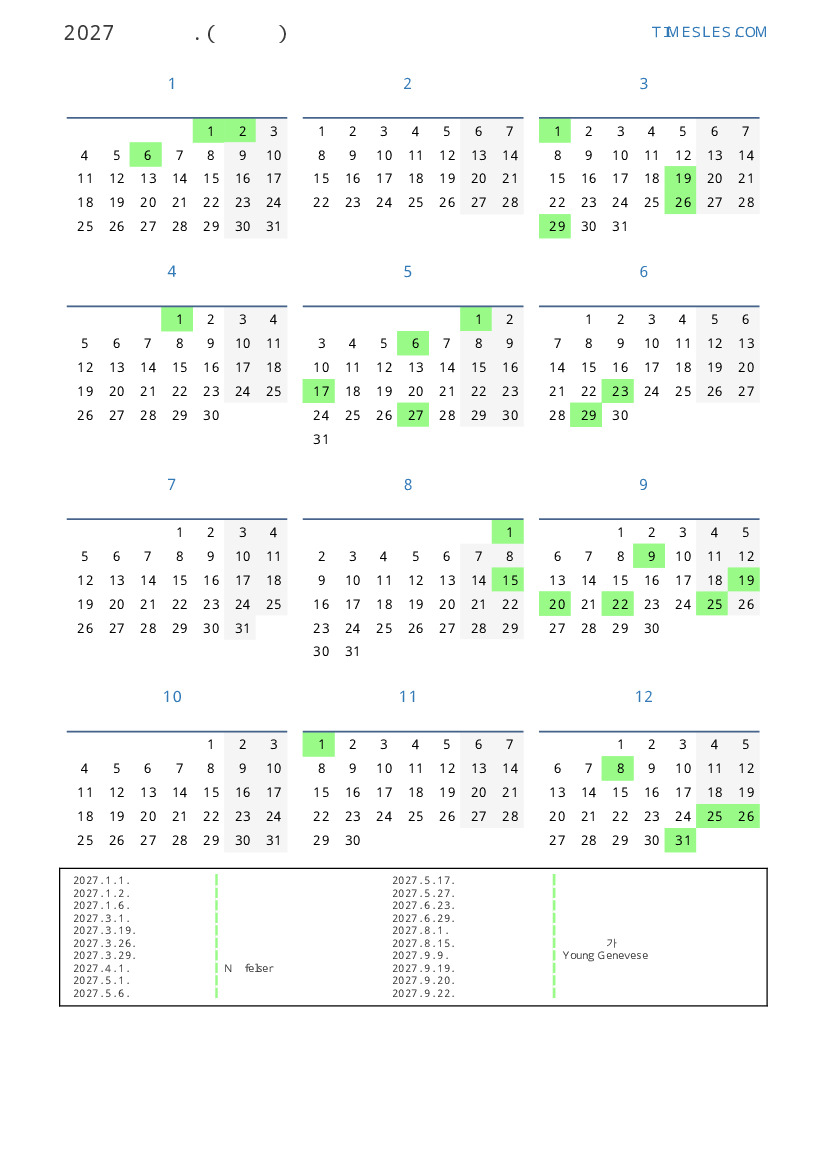 그레고리 안, 윤년이 아니다, 1 년에 365 일. 2027년 스위스에서 40 공휴일 및 휴무 있습니다. 중국 동부 달력에서 2027 년은 양의 해입니다. 연도는 금요일에 시작하여 금요일에 끝납니다.