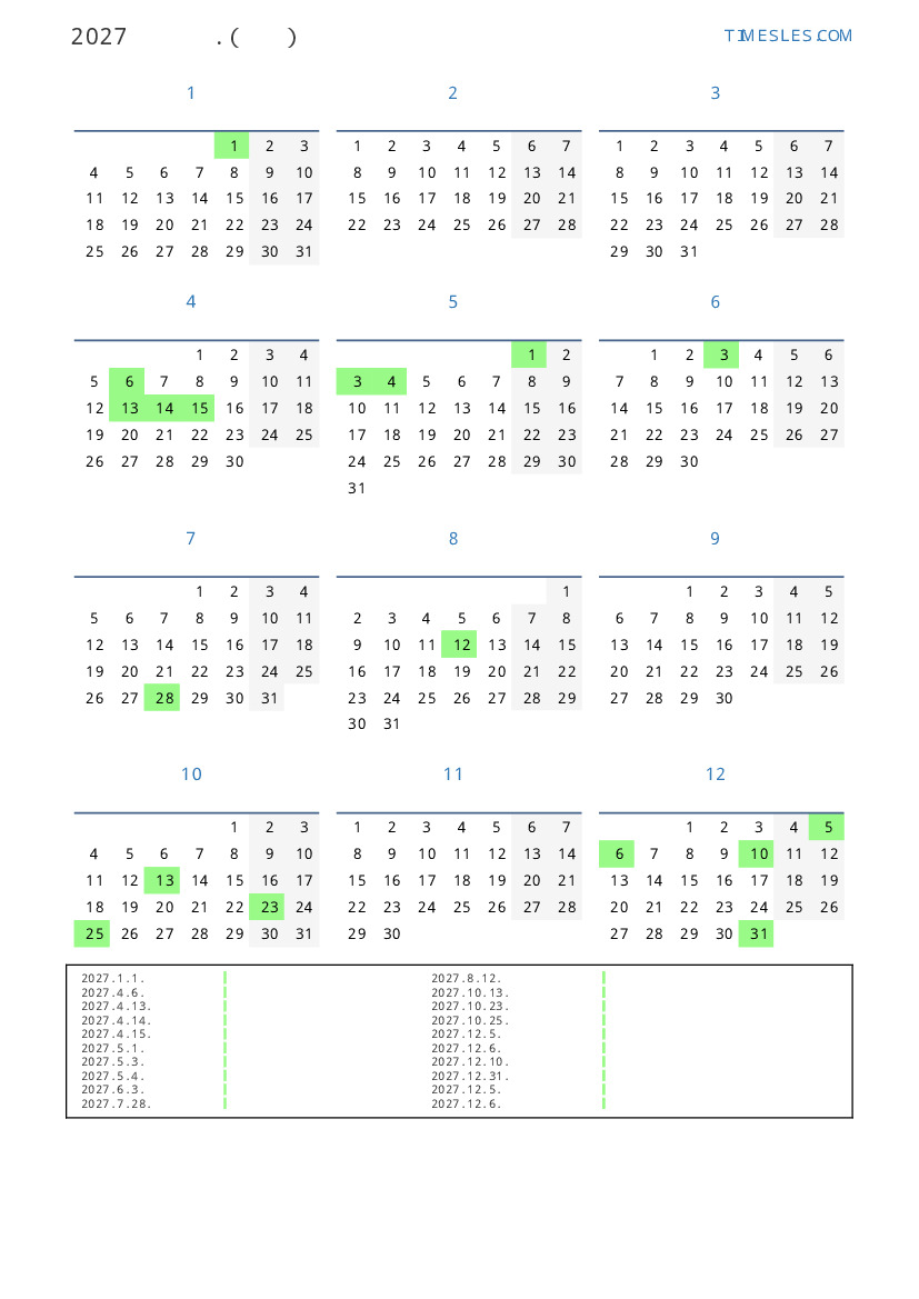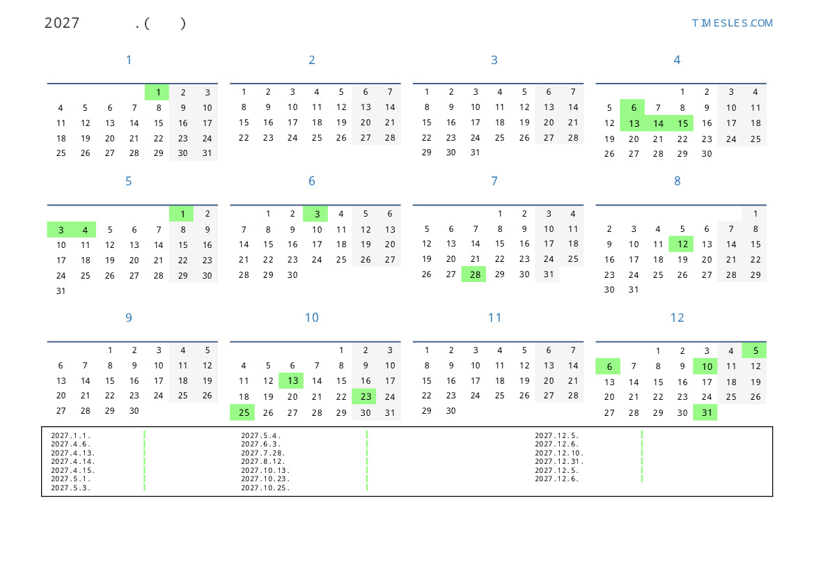 그레고리 안, 윤년이 아니다, 1 년에 365 일. 2027년 태국에서 33 공휴일 및 휴무 있습니다. 중국 동부 달력에서 2027 년은 양의 해입니다. 연도는 금요일에 시작하여 금요일에 끝납니다.