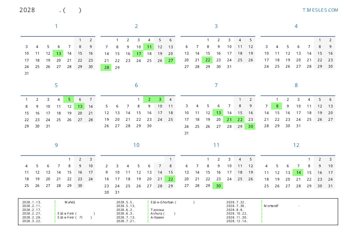 이란 의 2028 년 공휴일 및 주말 달력