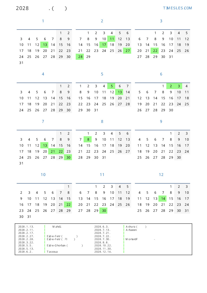 이란 2028 년 달력