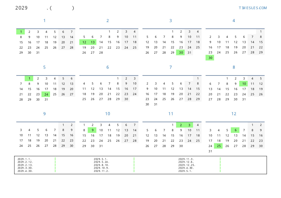 에콰도르 2029 년 공휴일 및 주말이 포함 된 PDF 캘린더 다운로드 및 인쇄
