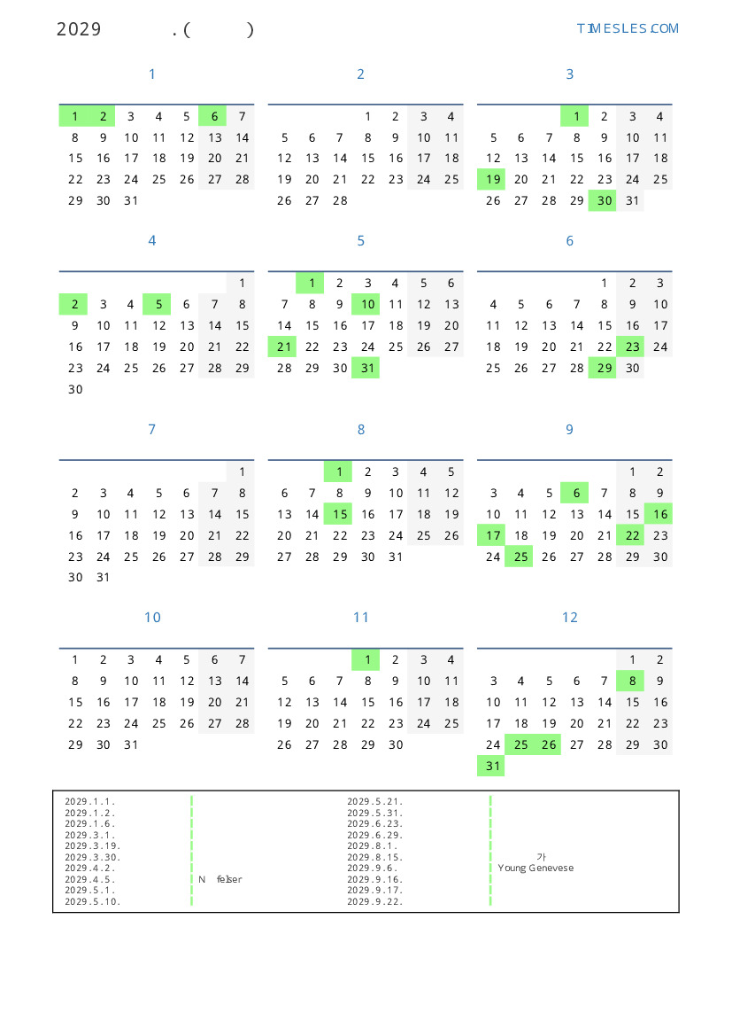 스위스 2029 년 공휴일 및 주말이 포함 된 PDF 캘린더 다운로드 및 인쇄