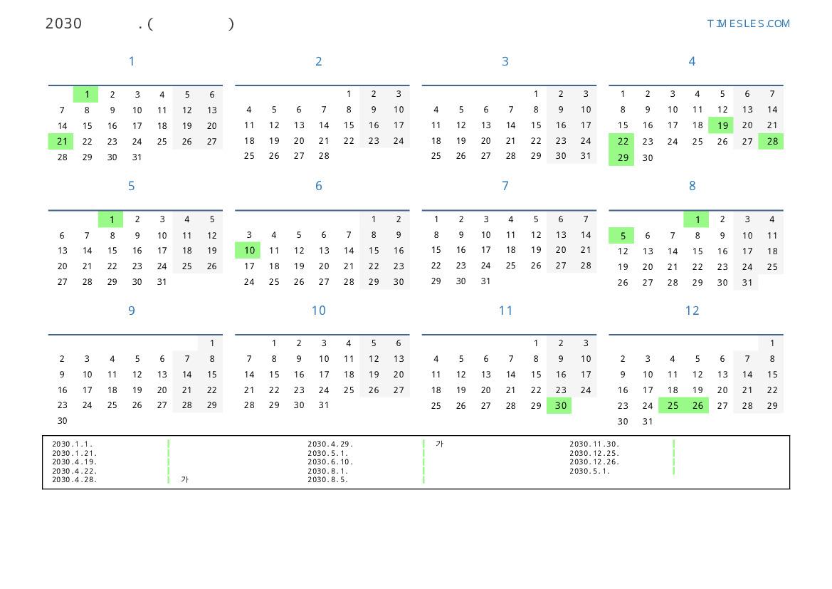 그레고리 안, 윤년이 아니다, 1 년에 365 일. 2030년 바베이도스 26 공휴일 및 휴무 있습니다. 중국 동부 달력에서 2030 년은 개 년입니다. 연도는 화요일에 시작하여 화요일에 끝납니다.