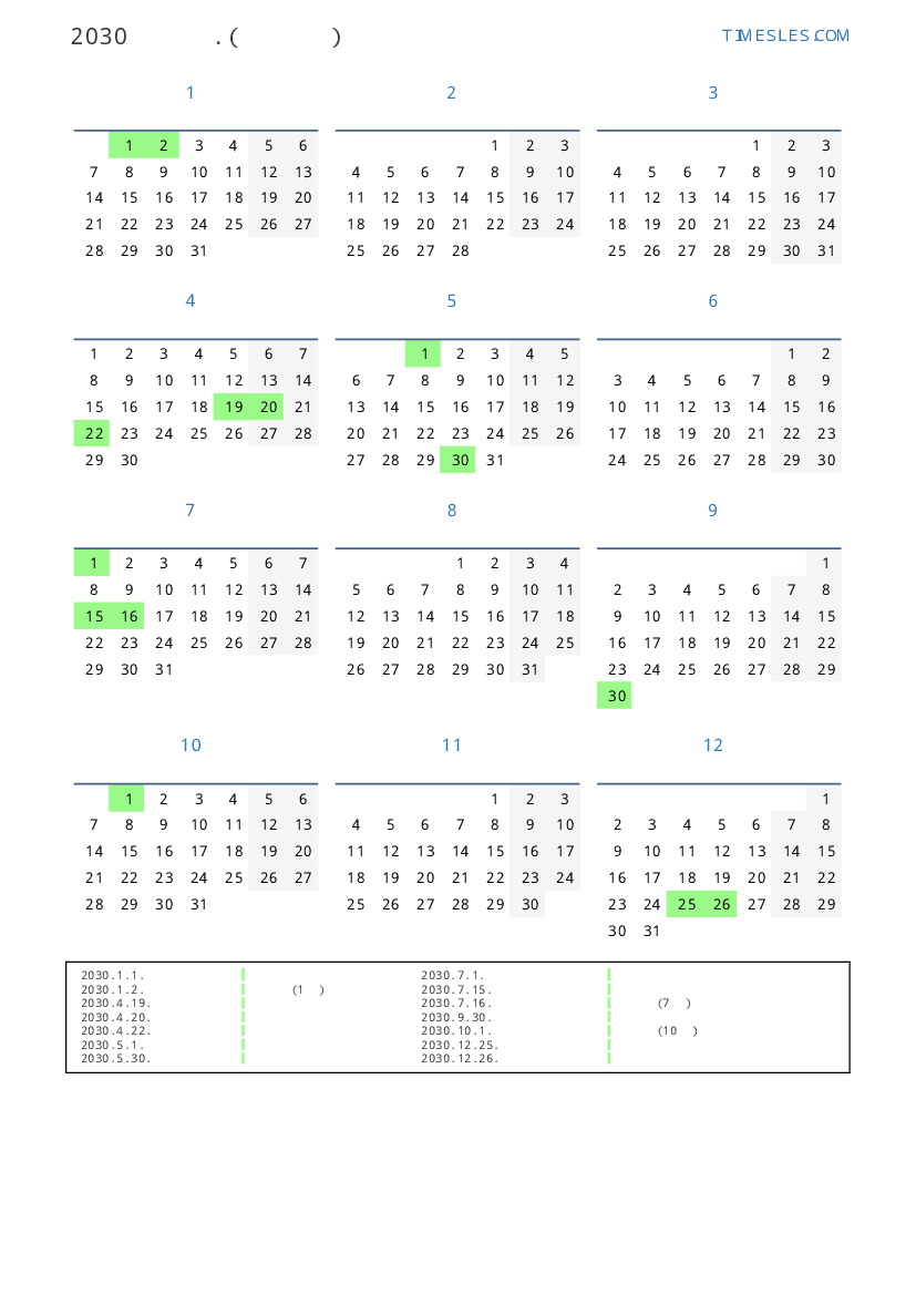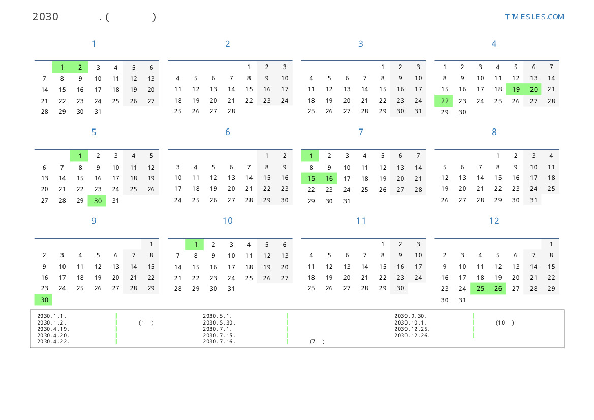 그레고리 안, 윤년이 아니다, 1 년에 365 일. 2030년 보츠와나 20 공휴일 및 휴무 있습니다. 중국 동부 달력에서 2030 년은 개 년입니다. 연도는 화요일에 시작하여 화요일에 끝납니다.