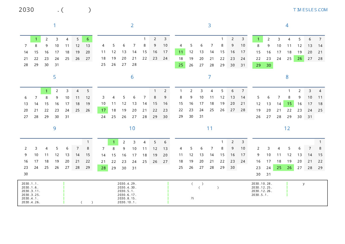 그레고리 안, 윤년이 아니다, 1 년에 365 일. 2030년 키프로스 26 공휴일 및 휴무 있습니다. 중국 동부 달력에서 2030 년은 개 년입니다. 연도는 화요일에 시작하여 화요일에 끝납니다.