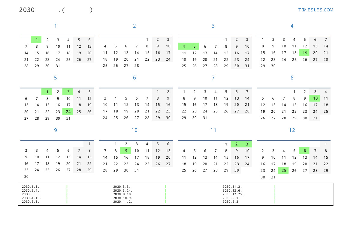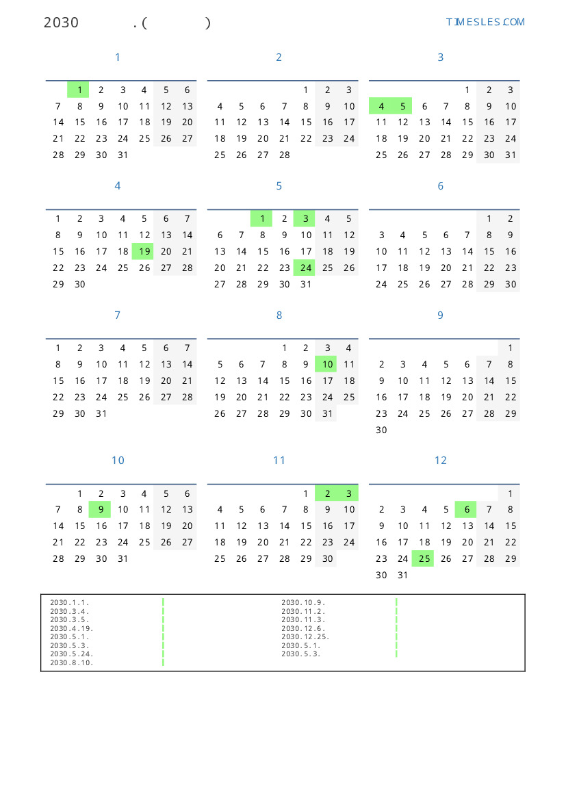 그레고리 안, 윤년이 아니다, 1 년에 365 일. 2030년 에콰도르 24 공휴일 및 휴무 있습니다. 중국 동부 달력에서 2030 년은 개 년입니다. 연도는 화요일에 시작하여 화요일에 끝납니다.