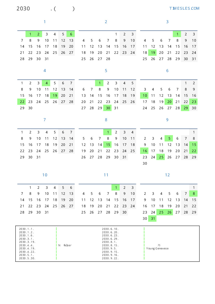 그레고리 안, 윤년이 아니다, 1 년에 365 일. 2030년 스위스에서 40 공휴일 및 휴무 있습니다. 중국 동부 달력에서 2030 년은 개 년입니다. 연도는 화요일에 시작하여 화요일에 끝납니다.