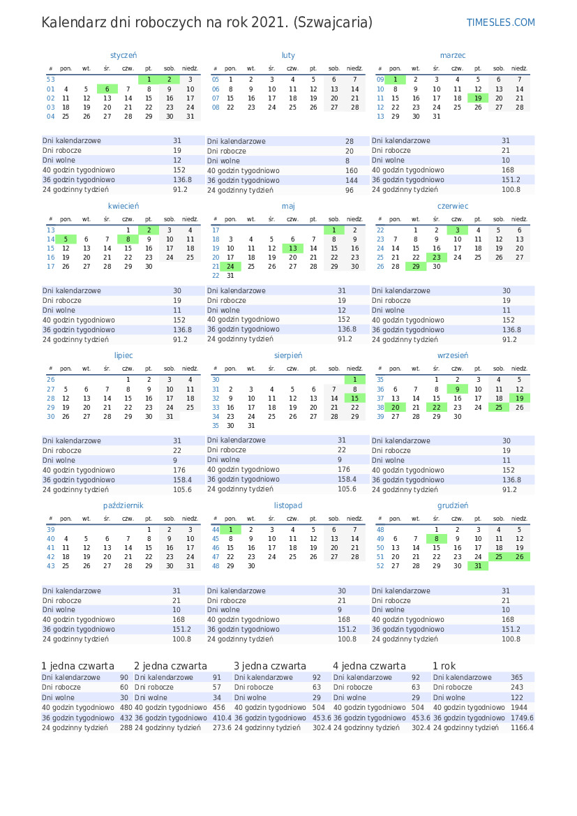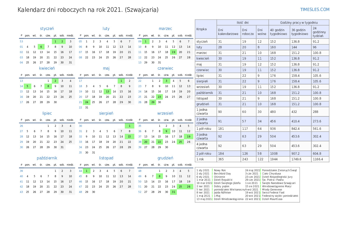 Kalendarz dni roboczych na luty 2021 r. dla Szwajcarii