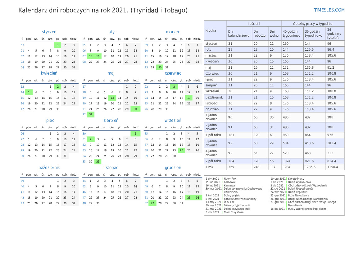 Kalendarz dni roboczych na luty 2021 r. Z tygodniami. Pięciodniowy tydzień pracy. W luty 2021 r. na Trynidadzie i Tobago 4 świąt i dni wolnych. Kalendarz z godzinami pracy i odroczonymi dniami wolnymi.
