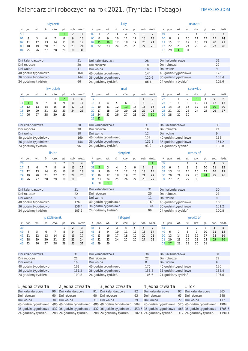 Kalendarz dni roboczych na luty 2021 r. dla Trynidadu i Tobago