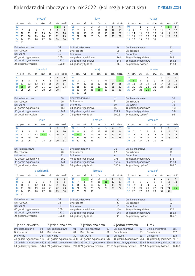 Kalendarz dni roboczych na czerwiec 2022 r. Z tygodniami. Pięciodniowy tydzień pracy. W czerwiec 2022 r. w Polinezji Francuskiej 3 świąt i dni wolnych. Kalendarz z godzinami pracy i odroczonymi dniami wolnymi.