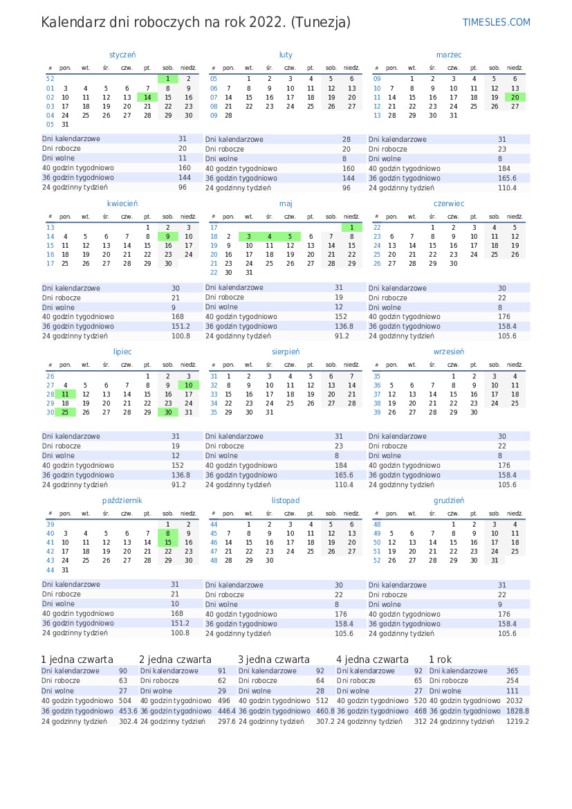 Kalendarz dni roboczych na grudzień 2022 r. dla Tunezji