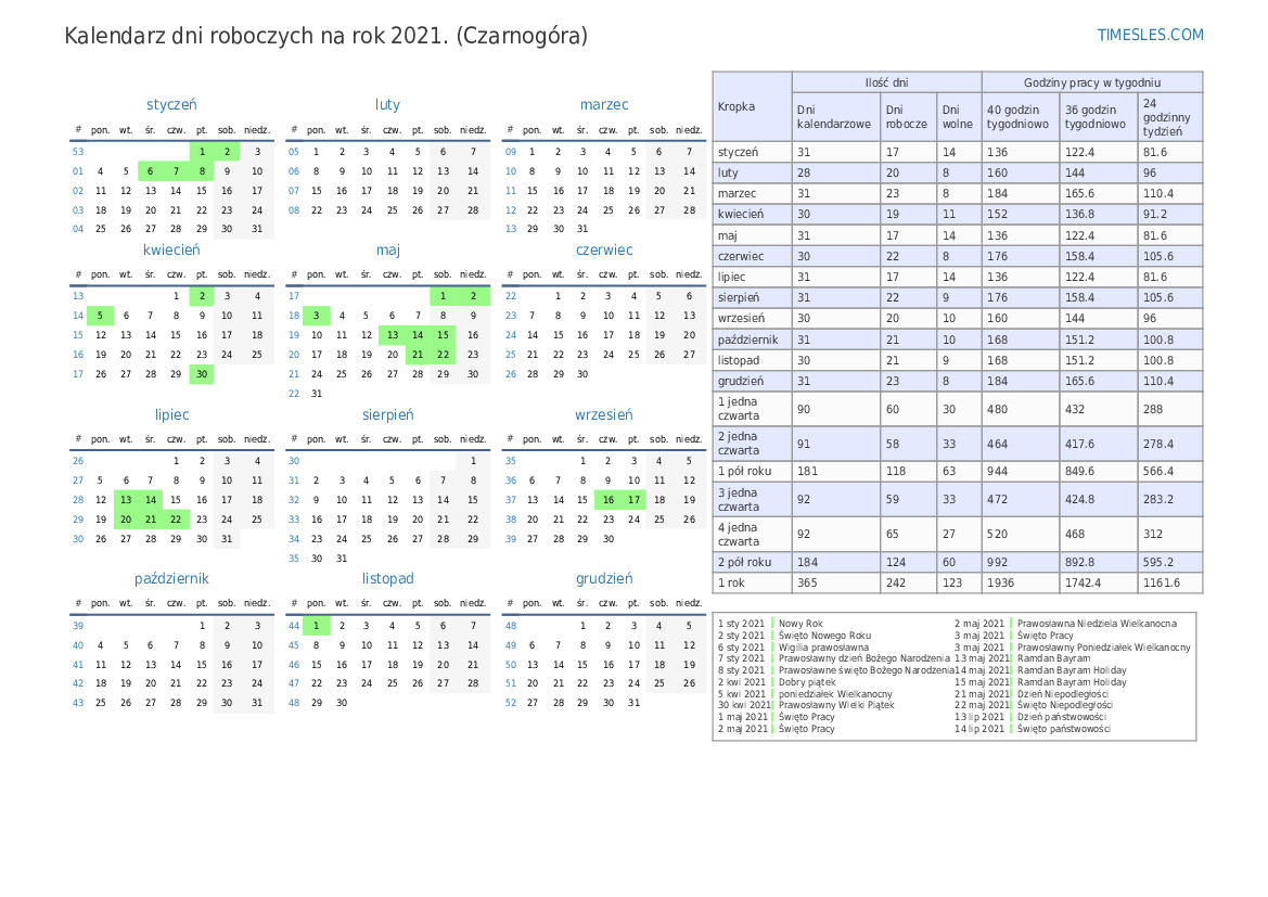 Kalendarz dni roboczych ze świętami i weekendami na 1. kwartał 2021 roku dla Czarnogóry
