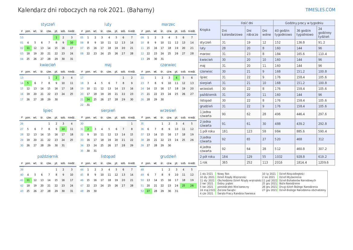 Kalendarz dni roboczych ze świętami i weekendami na 1. kwartał 2021 roku dla Bahamów