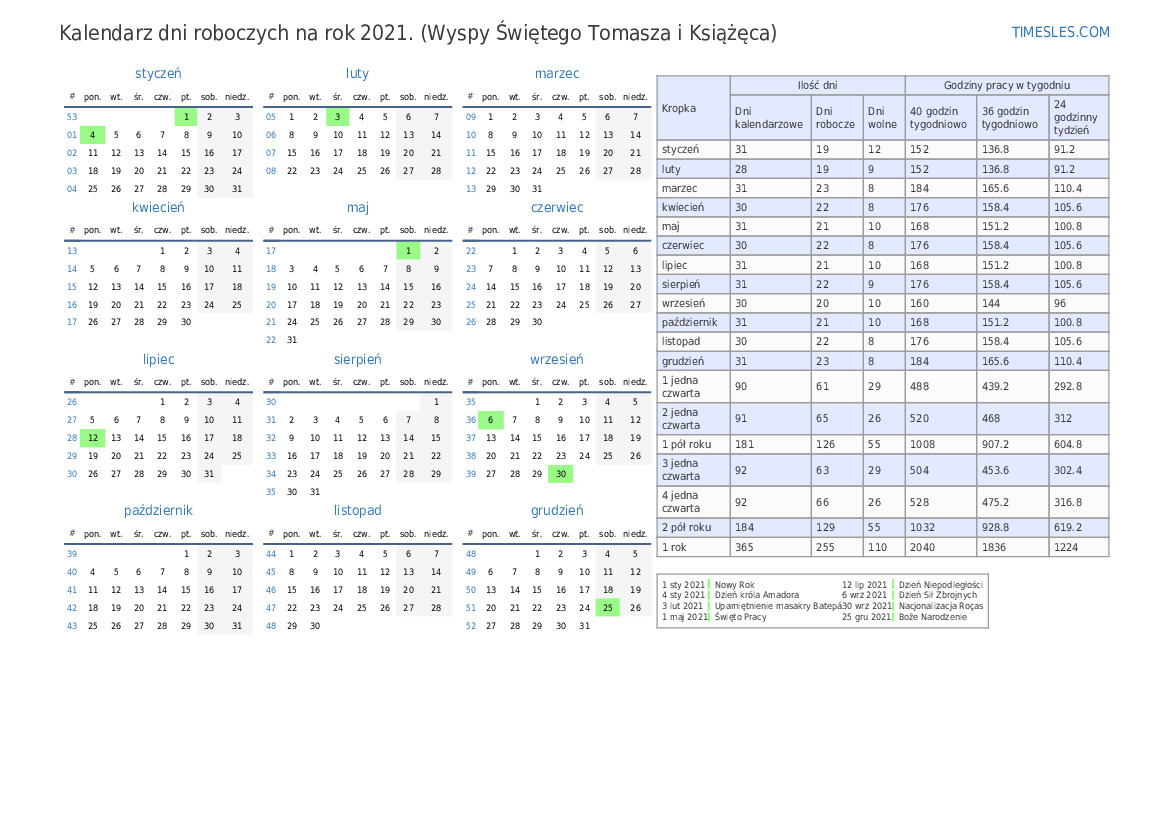 Pobierz i wydrukuj kalendarz dni roboczych w formacie PDF ze świętami i weekendami na 4. kwartał 2021 r. na Wyspach Świętego Tomasza i Książęcej