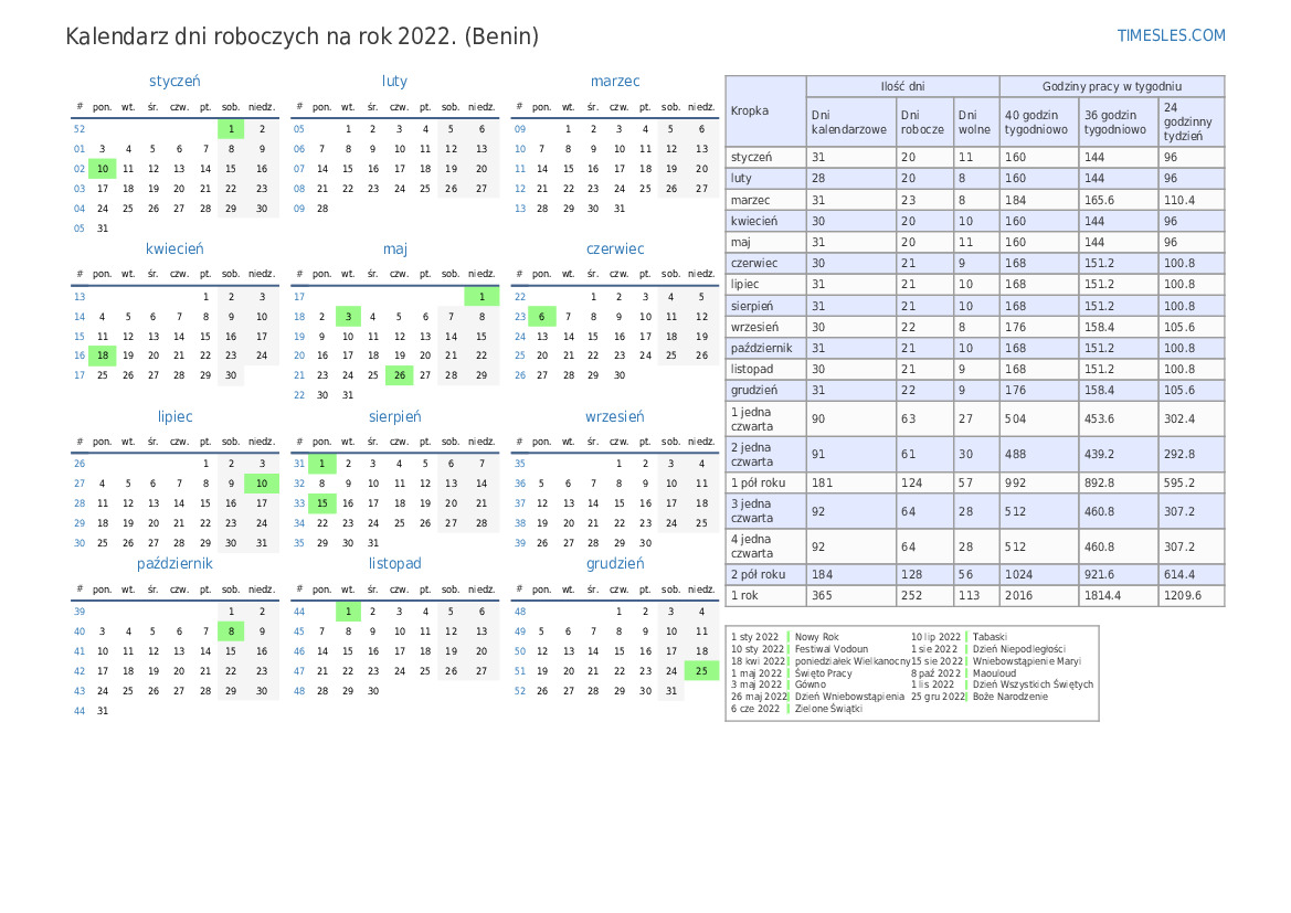 Kalendarz dni roboczych ze świętami i weekendami na 4. kwartał 2022 roku dla Beninu