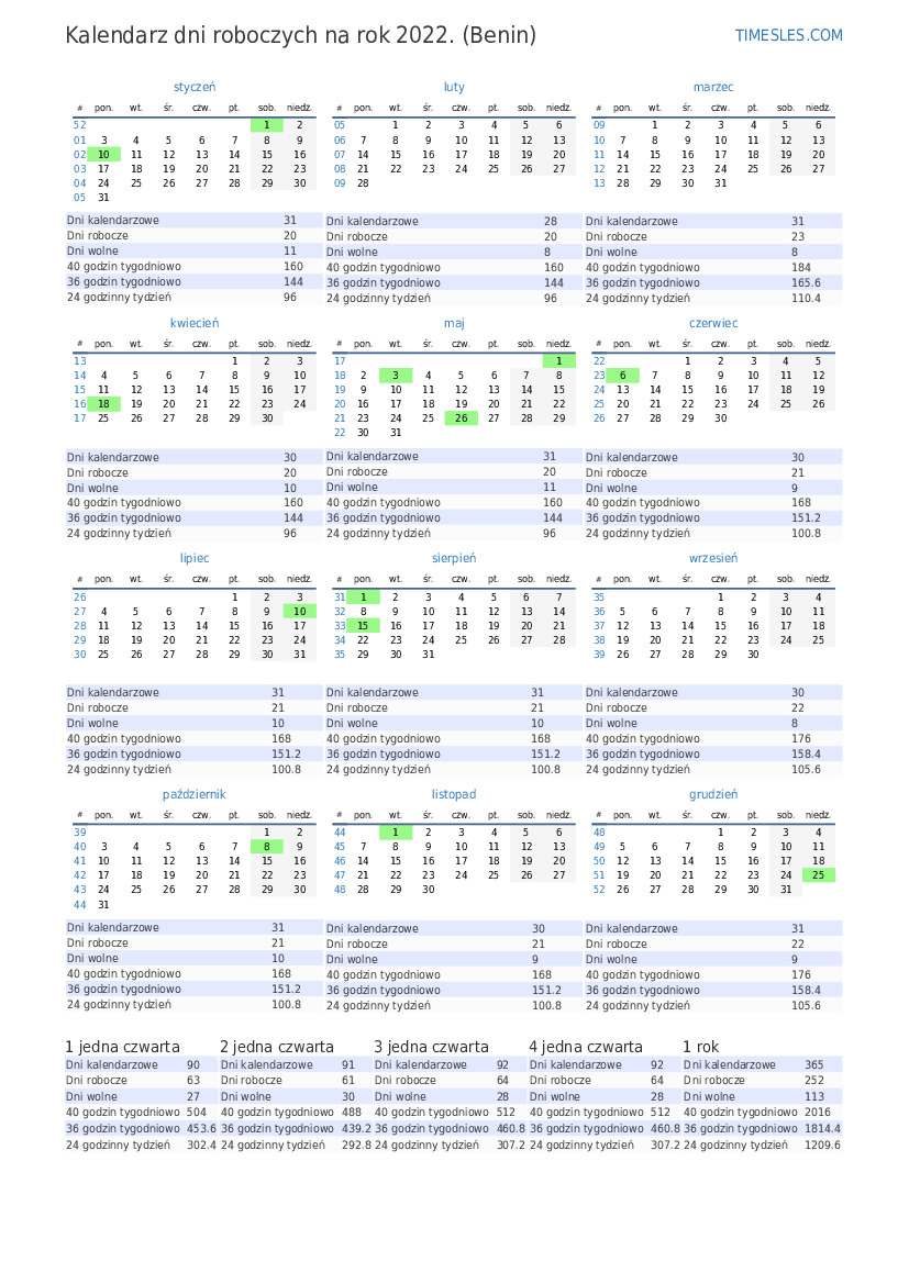 Kalendarz na 4. kwartał 2022 r. dla Beninu