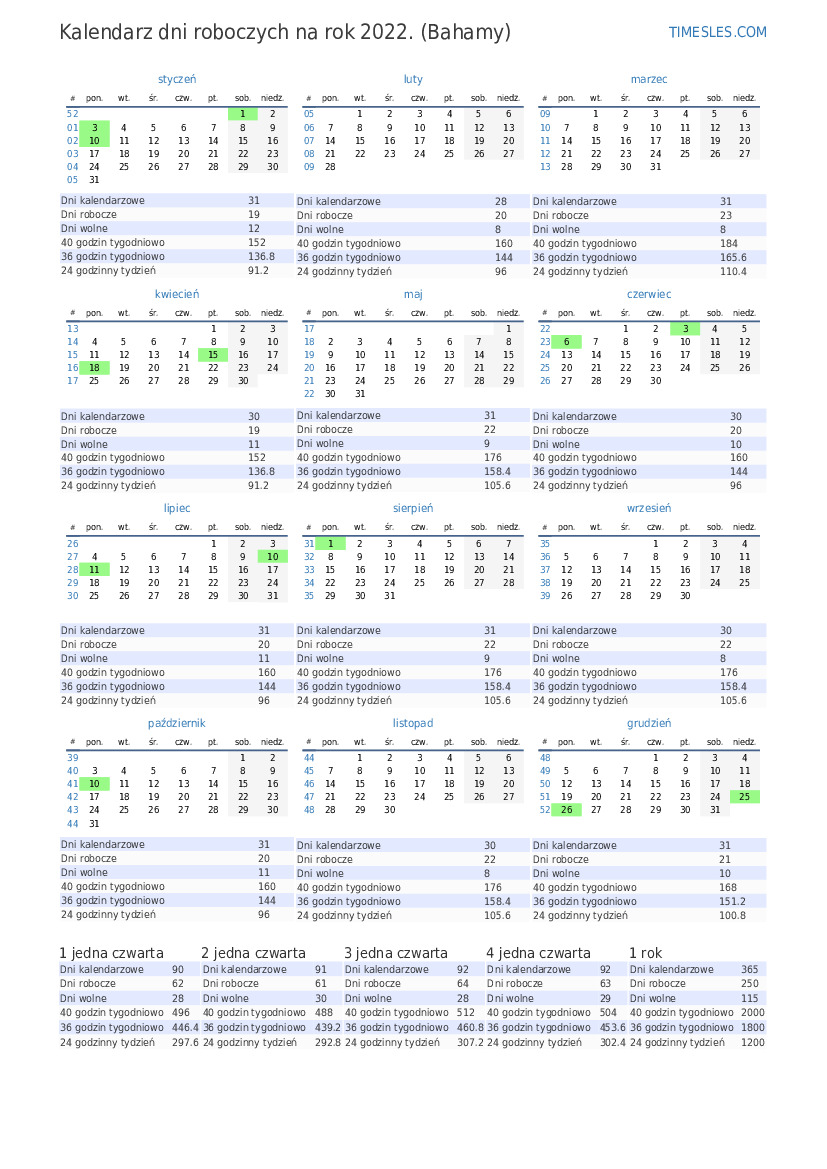 Pobierz i wydrukuj kalendarz dni roboczych w formacie PDF ze świętami i weekendami na 4. kwartał 2022 r. dla Bahamów