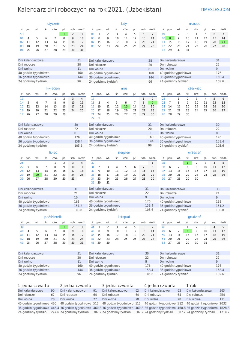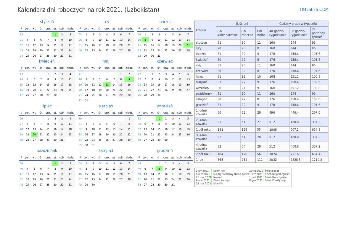 Dni wolne w maj 2021 r. w Uzbekistanie są 2 świąt i dni wolnych w maj 2021 r.