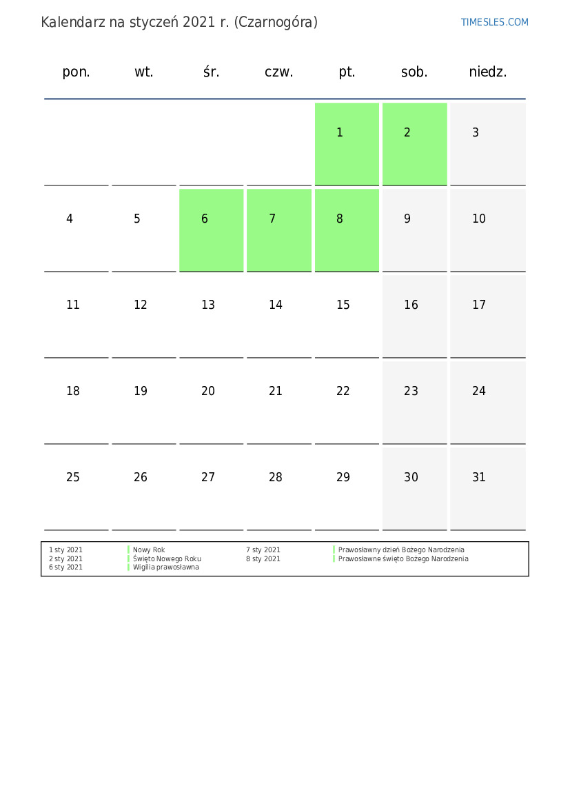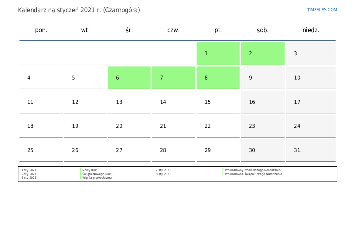 Pobierz i wydrukuj kalendarz PDF ze świętami i weekendami na styczeń 2021 r. dla Czarnogóry