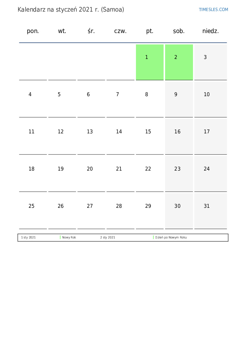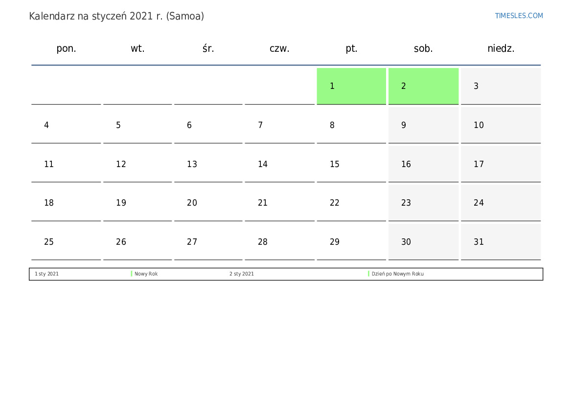 Pobierz i wydrukuj kalendarz PDF ze świętami i weekendami na styczeń 2021 r. dla Samoa