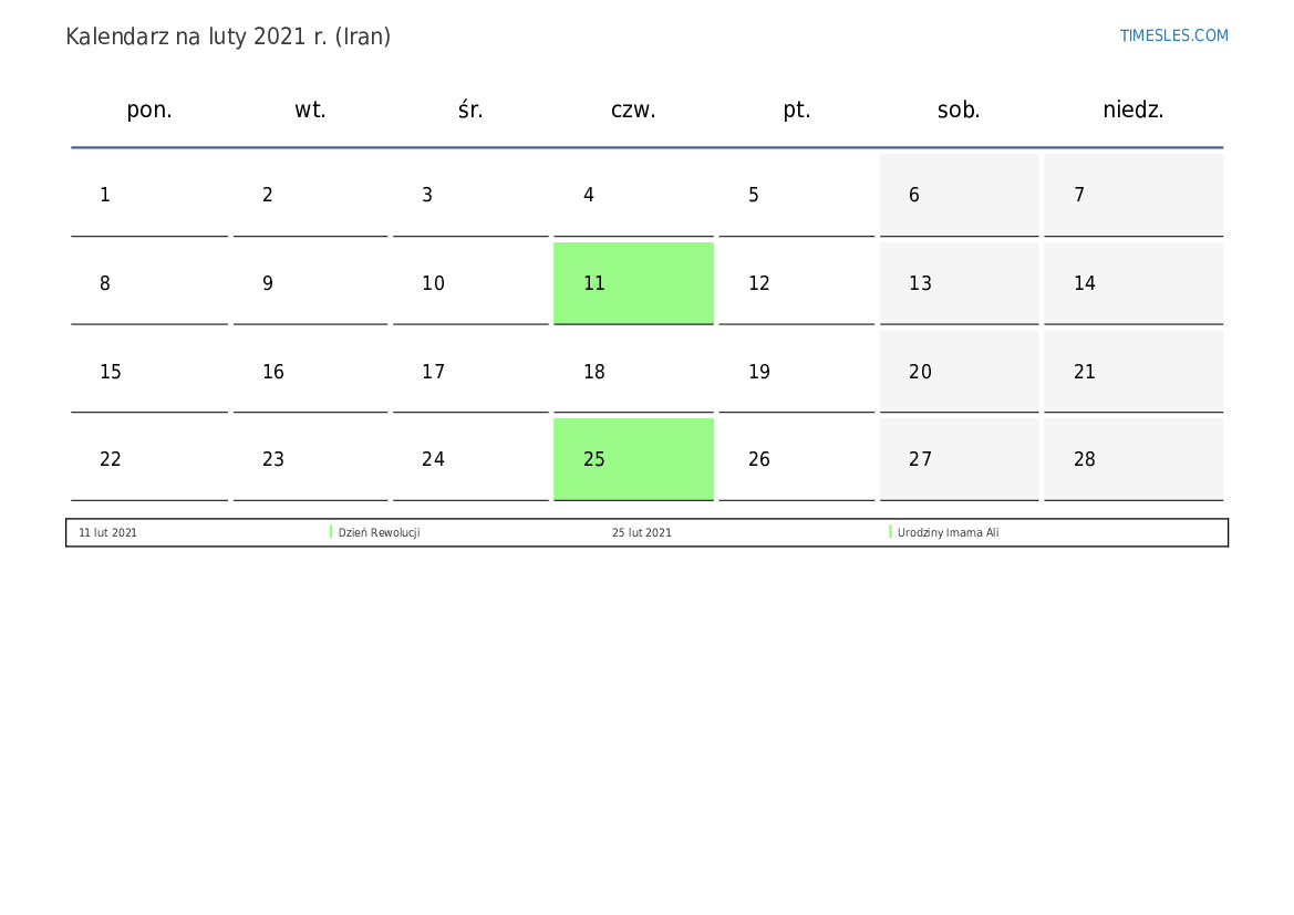 Pobierz i wydrukuj kalendarz PDF ze świętami i weekendami na luty 2021 r. dla Iranu