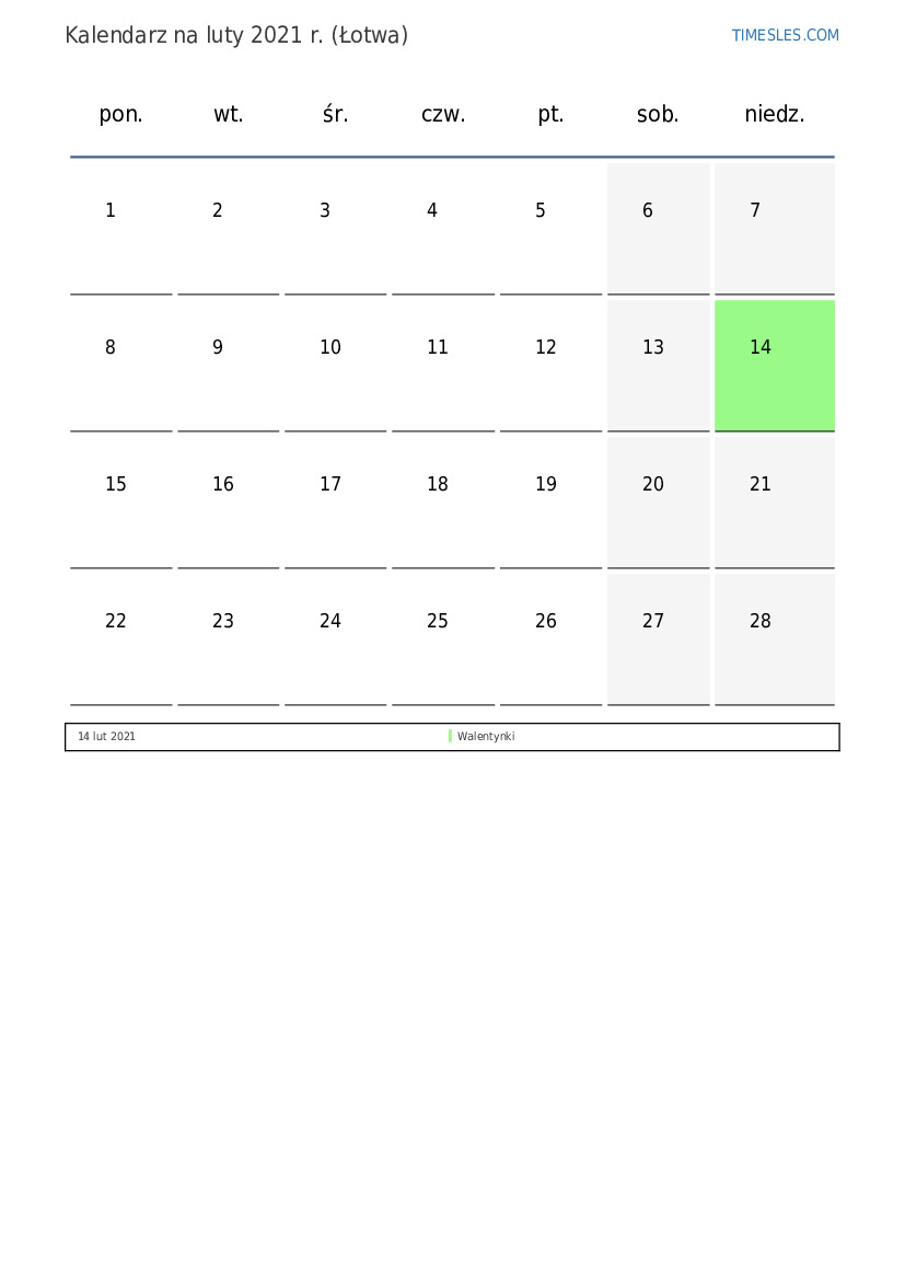 Pobierz i wydrukuj kalendarz PDF ze świętami i weekendami na luty 2021 r. dla Łotwy