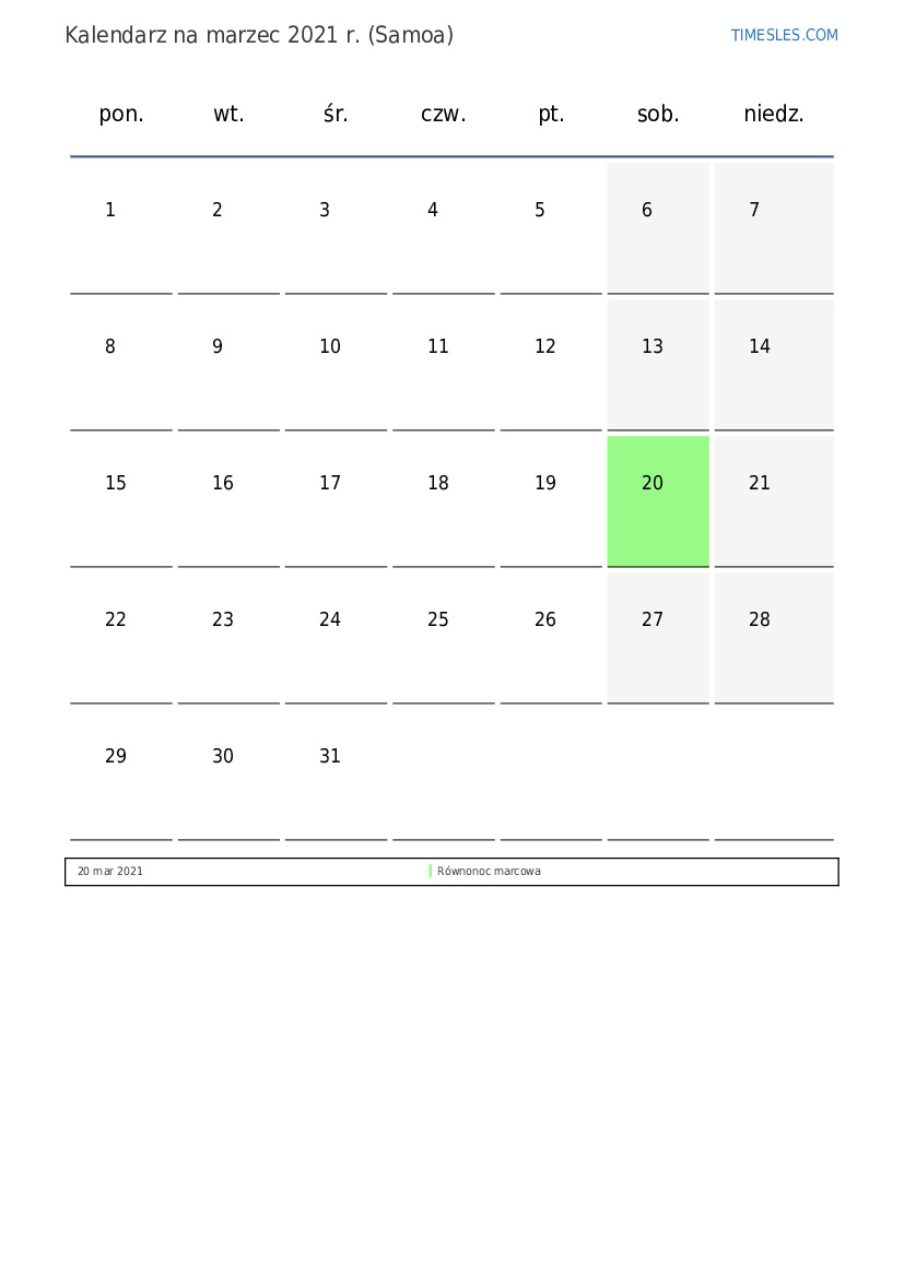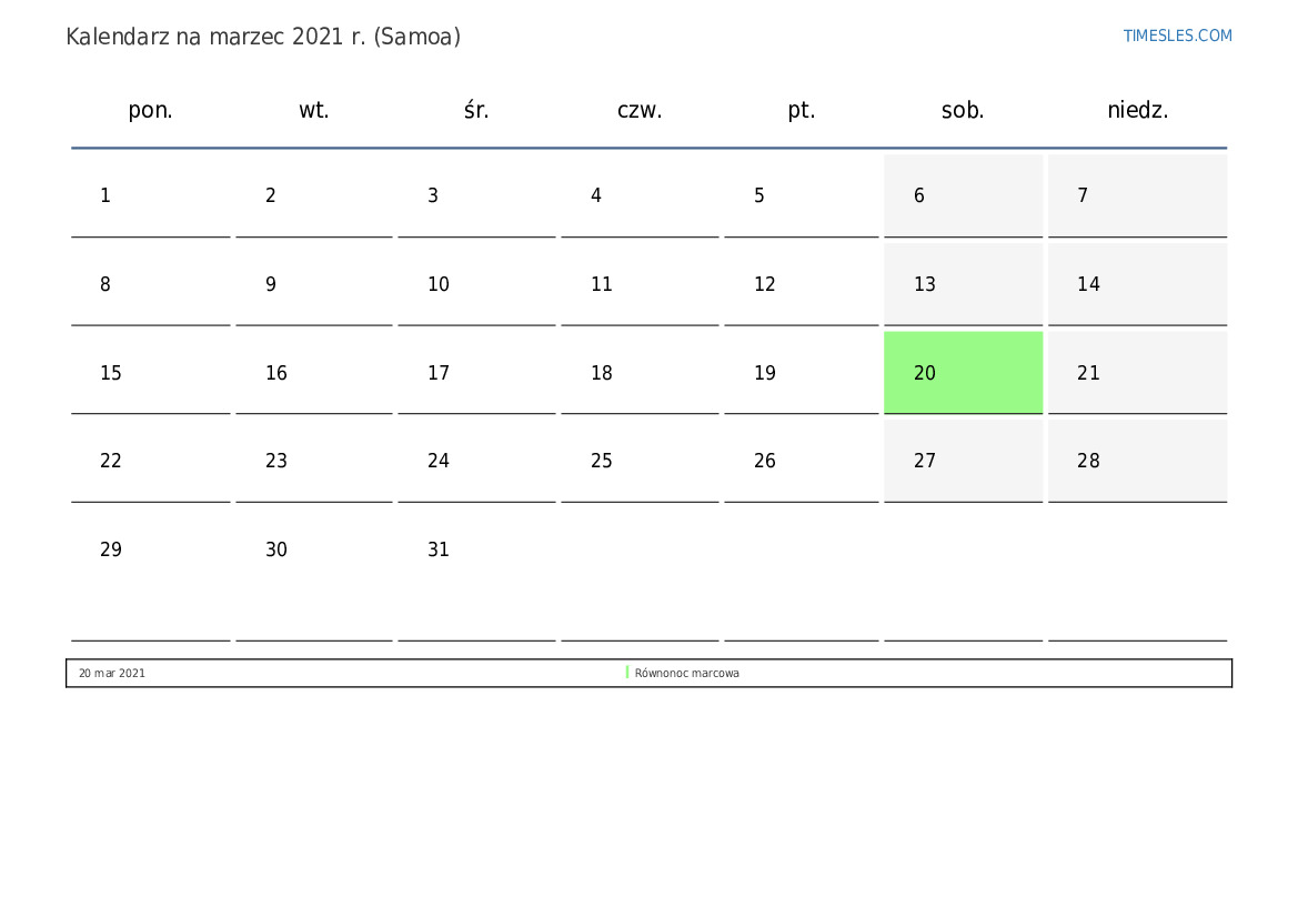 Pobierz i wydrukuj kalendarz PDF ze świętami i weekendami na marzec 2021 r. dla Samoa
