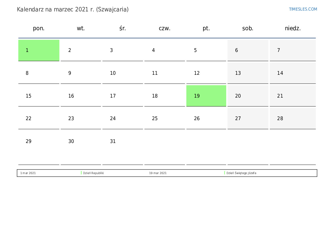 Pobierz i wydrukuj kalendarz PDF ze świętami i weekendami na marzec 2021 r. dla Szwajcarii