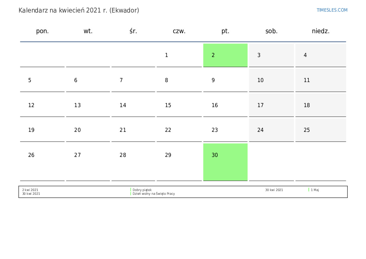 Pobierz i wydrukuj kalendarz PDF ze świętami i weekendami na kwiecień 2021 r. dla Ekwadoru