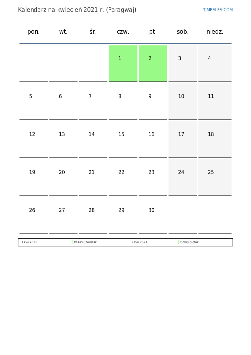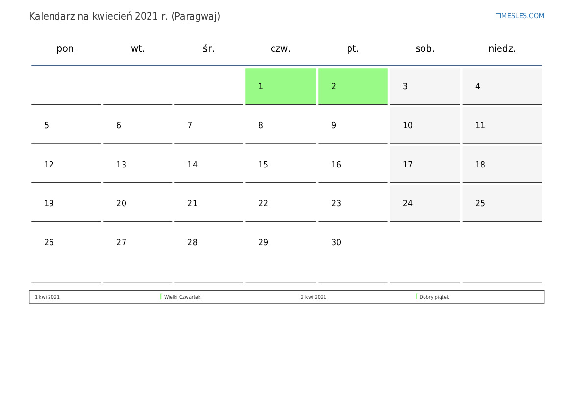 Pobierz i wydrukuj kalendarz PDF ze świętami i weekendami na kwiecień 2021 r. dla Paragwaju