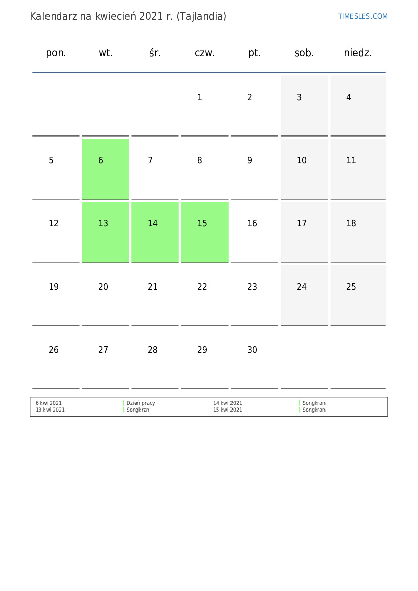 Pobierz i wydrukuj kalendarz PDF ze świętami i weekendami na kwiecień 2021 r. dla Tajlandii