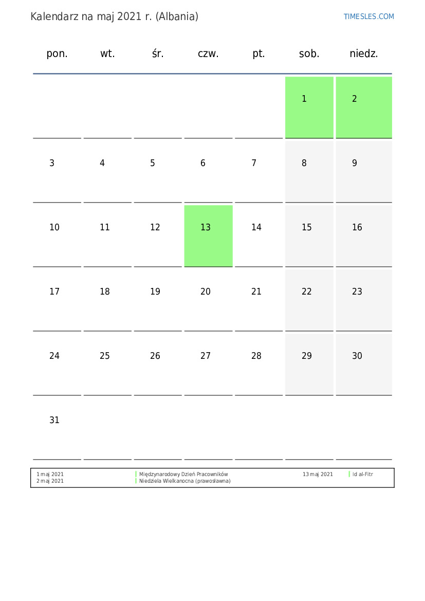 Pobierz i wydrukuj kalendarz PDF ze świętami i weekendami na maj 2021 r. dla Albanii