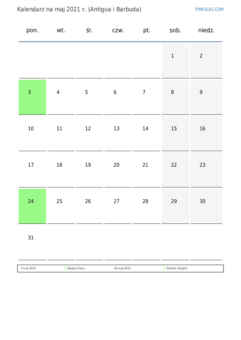 Kalendarz na maj 2021 r. dla Antigui i Barbudy