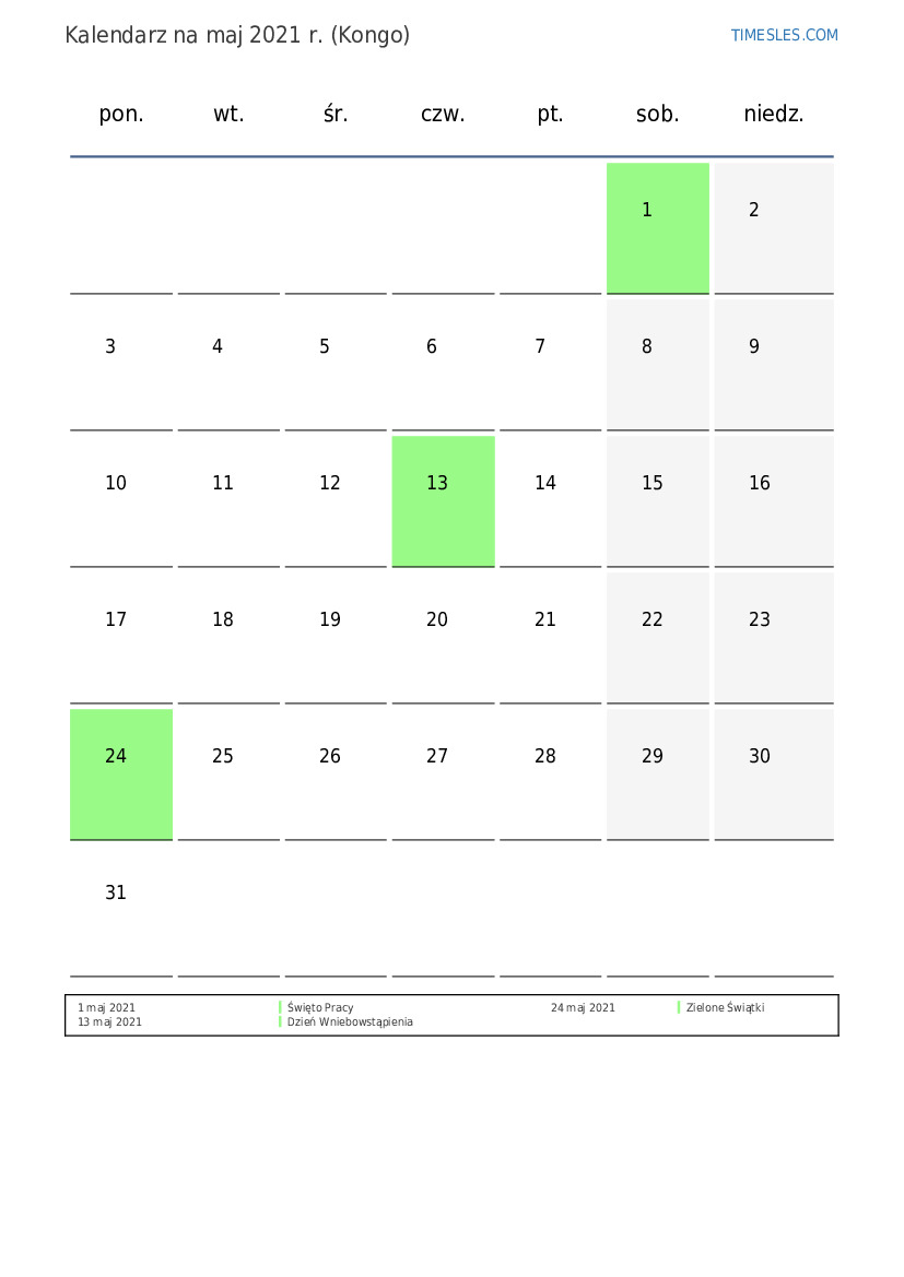Pobierz i wydrukuj kalendarz PDF ze świętami i weekendami na maj 2021 r. dla Konga