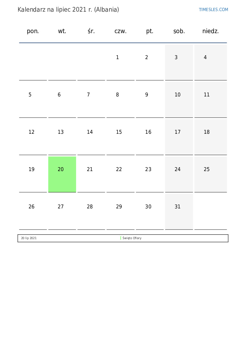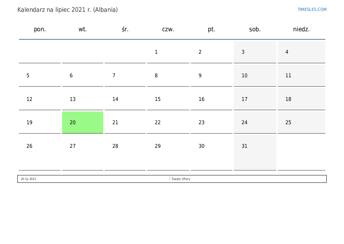 Pobierz i wydrukuj kalendarz PDF ze świętami i weekendami na lipiec 2021 r. dla Albanii