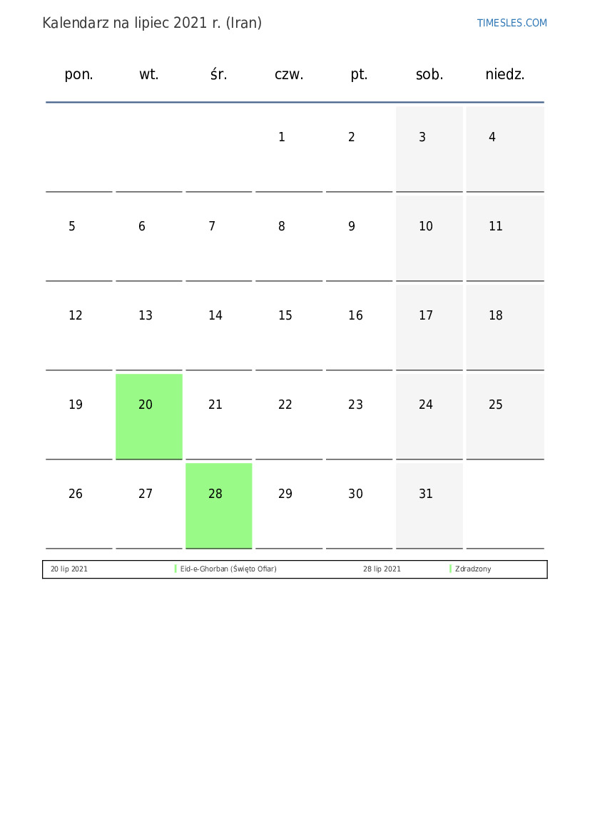 Kalendarz świąt i weekendów na lipiec 2021 r. dla Iranu
