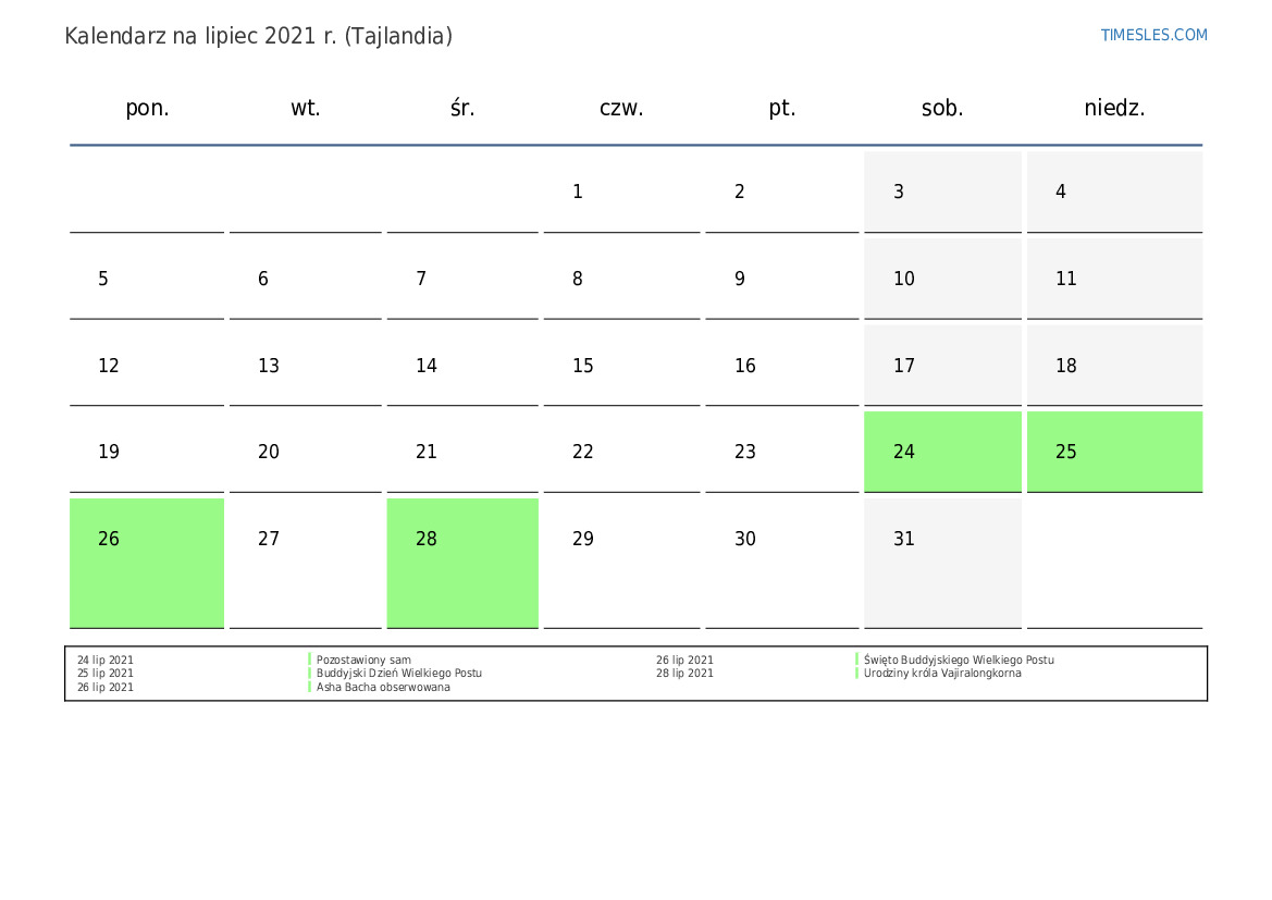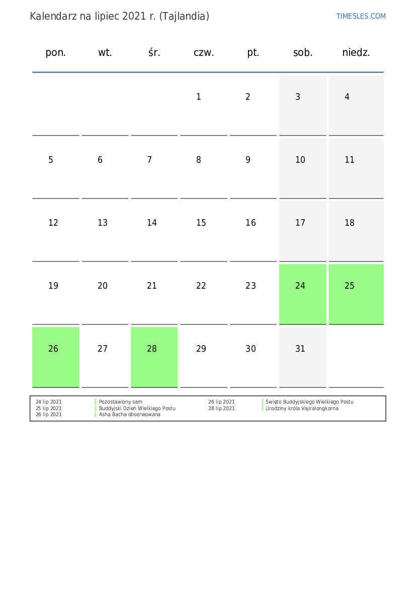 Pobierz i wydrukuj kalendarz PDF ze świętami i weekendami na lipiec 2021 r. dla Tajlandii