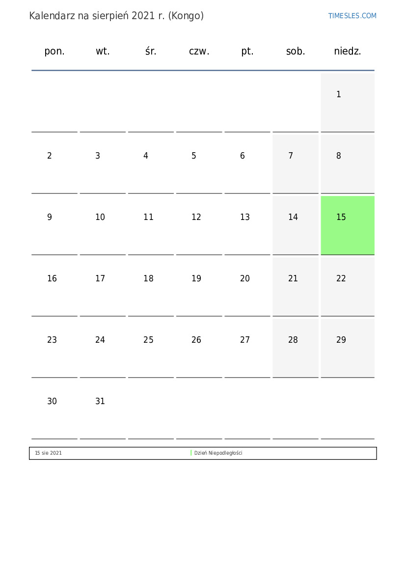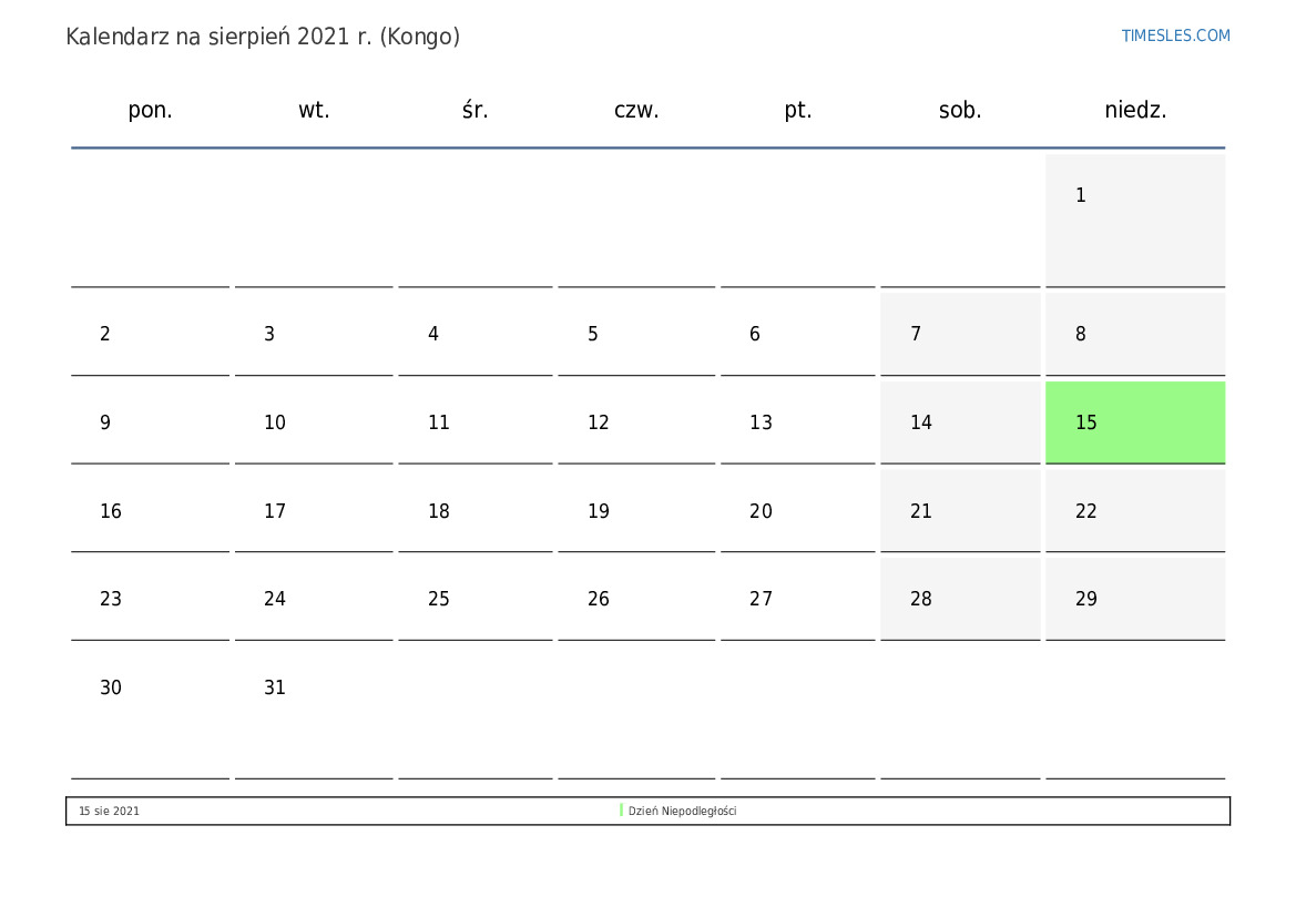 Pobierz i wydrukuj kalendarz PDF ze świętami i weekendami na sierpień 2021 r. dla Konga