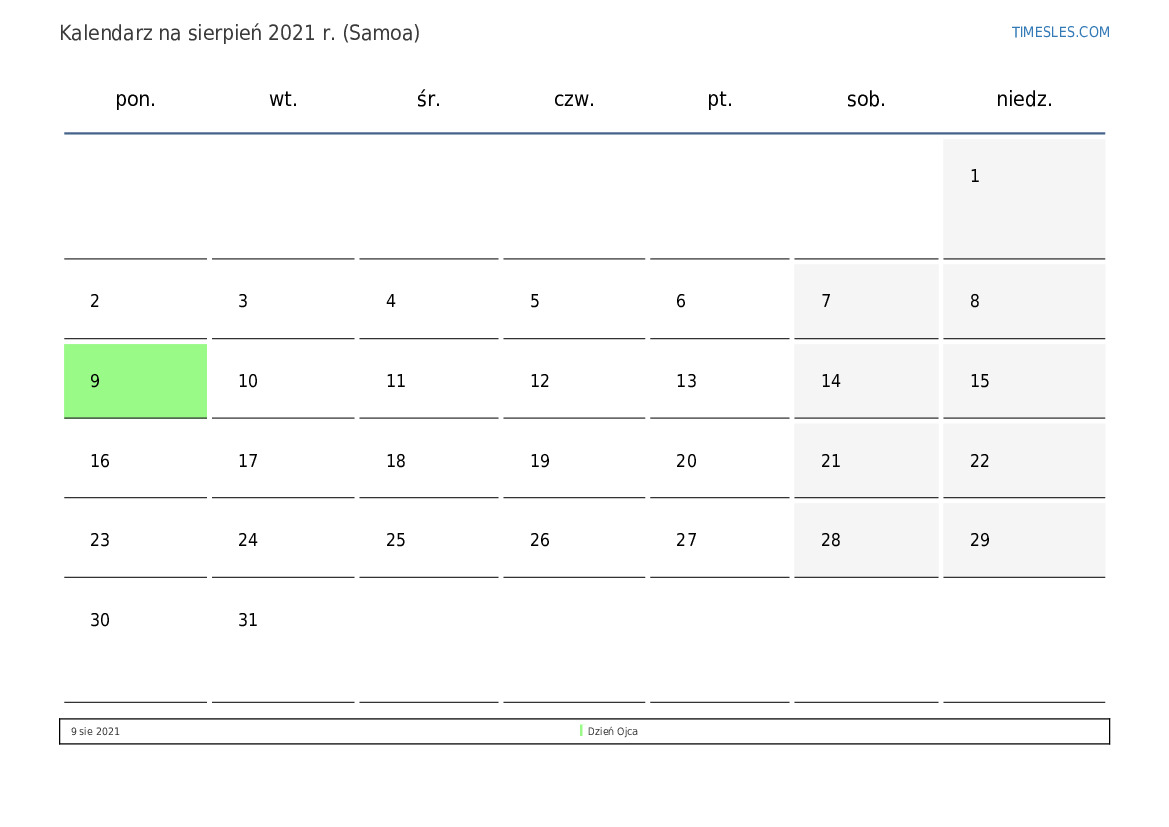 Pobierz i wydrukuj kalendarz PDF ze świętami i weekendami na sierpień 2021 r. dla Samoa