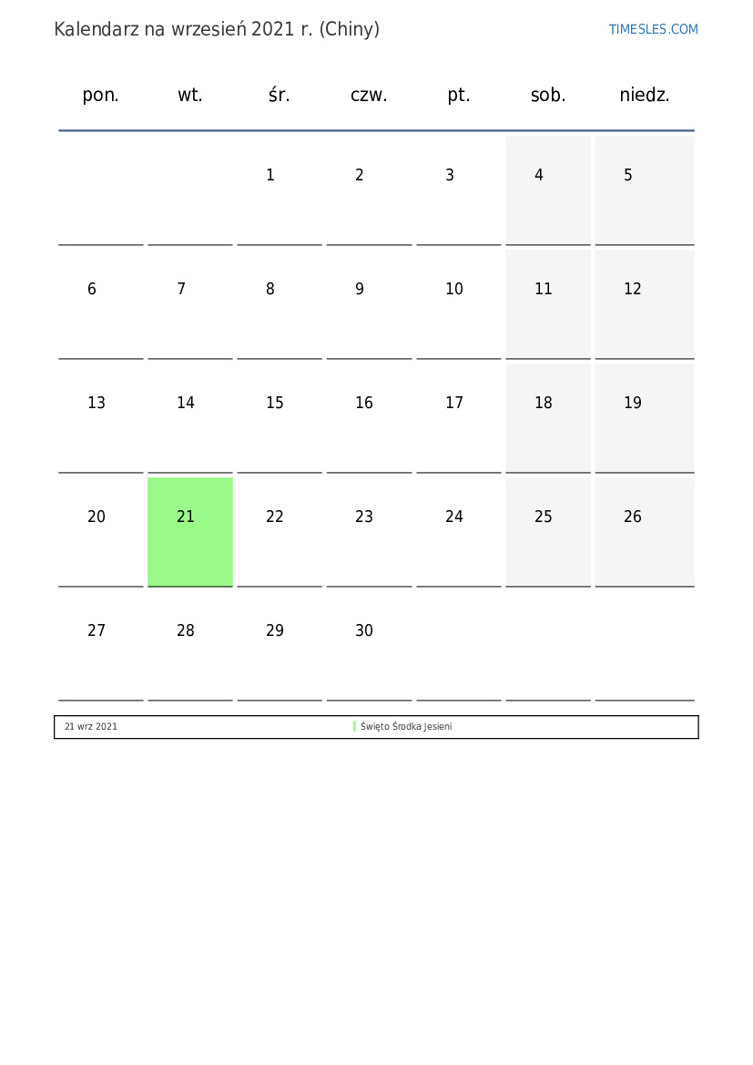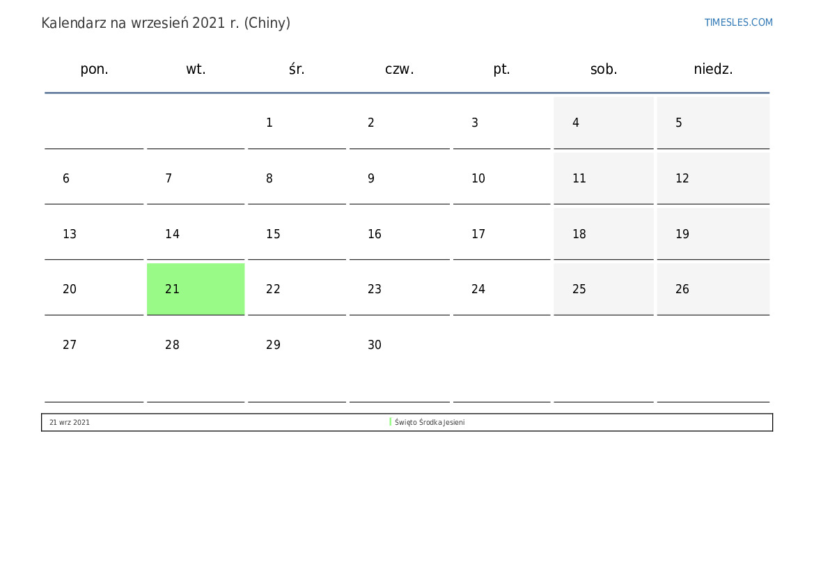 Pobierz i wydrukuj kalendarz PDF ze świętami i weekendami na wrzesień 2021 r. dla Chin