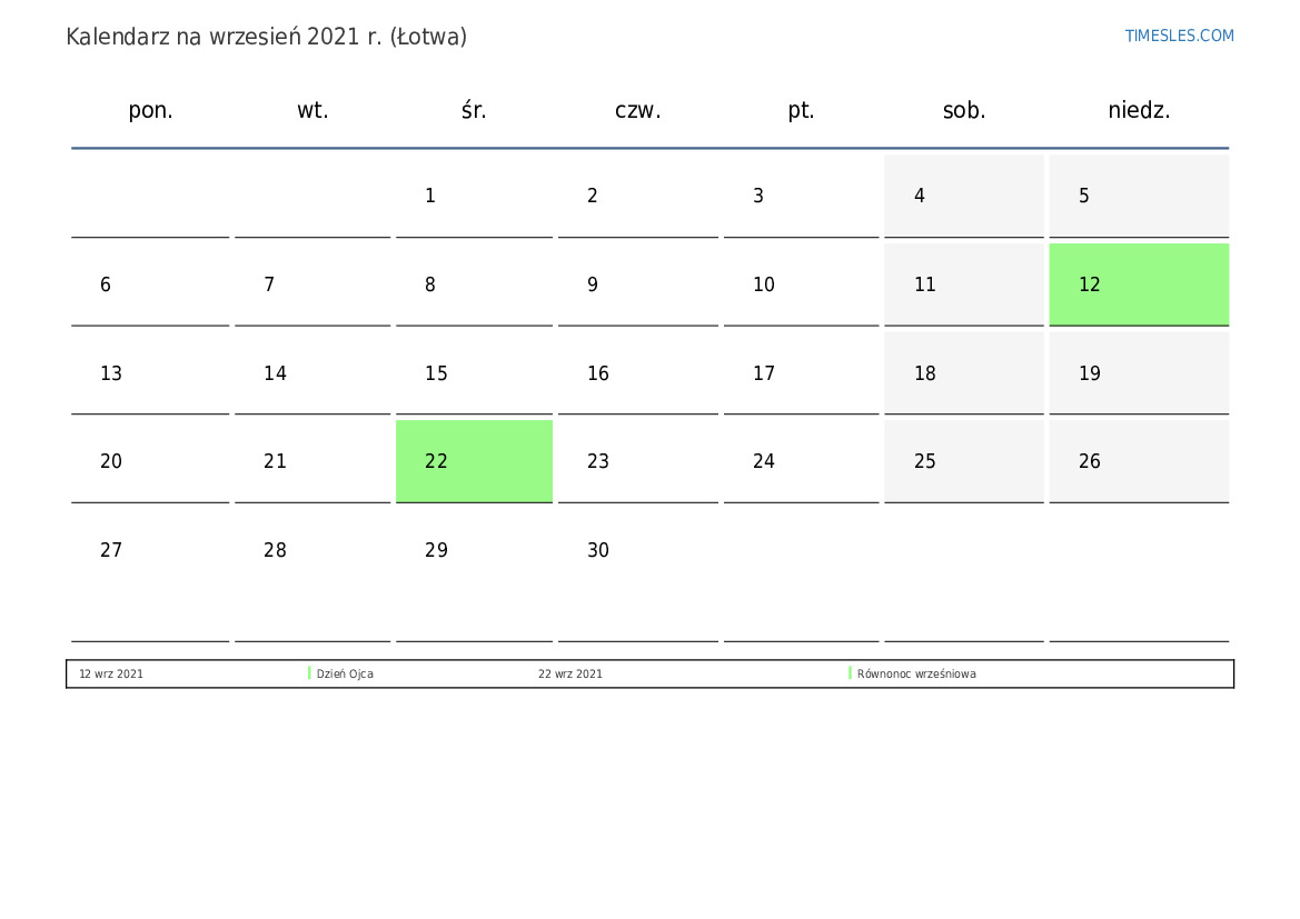 Kalendarz na wrzesień 2021 r. dla Łotwy