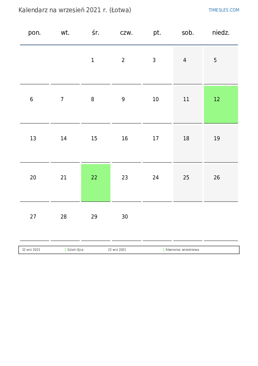 Pobierz i wydrukuj kalendarz PDF ze świętami i weekendami na wrzesień 2021 r. dla Łotwy