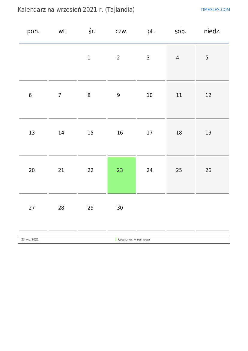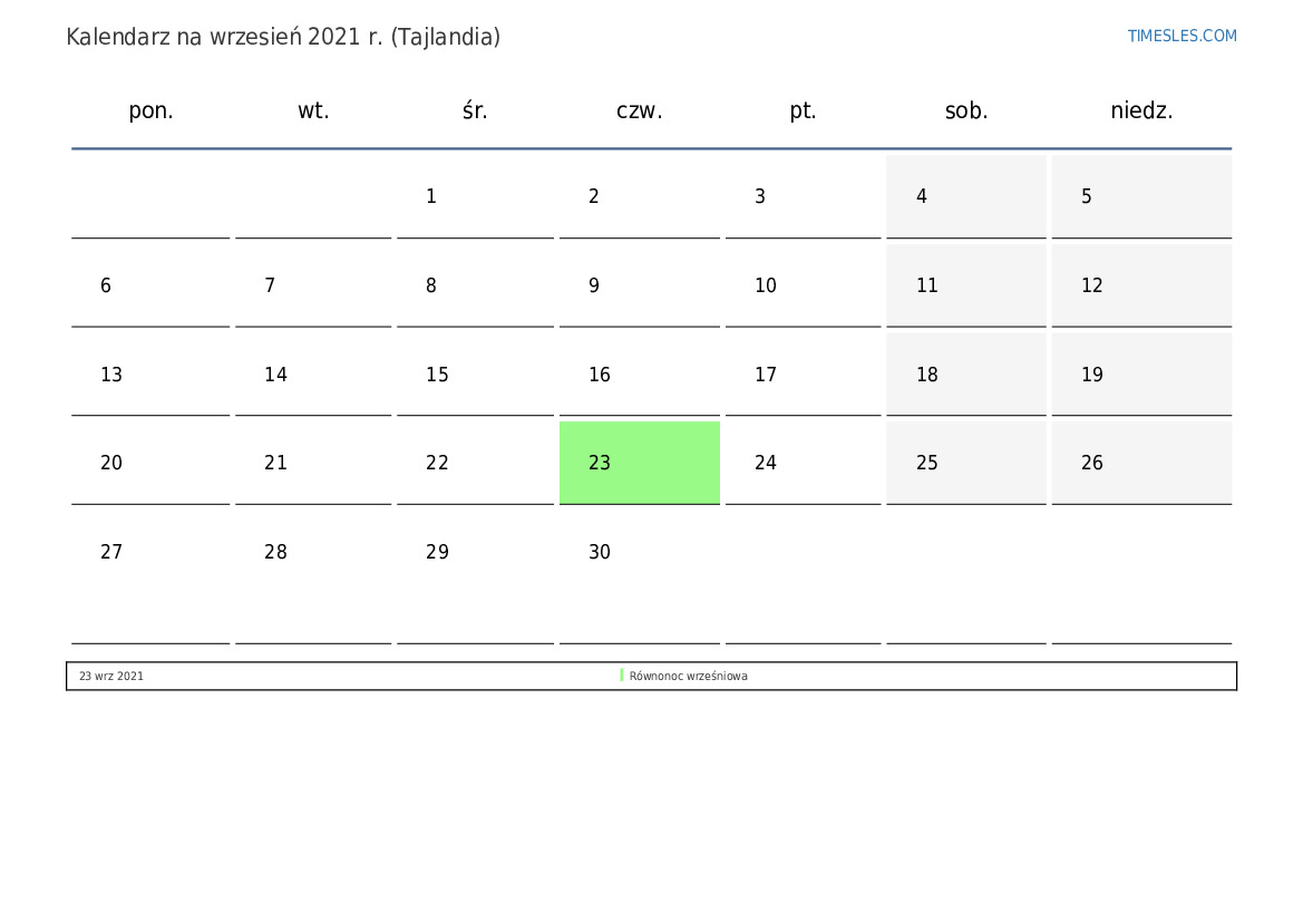 wrzesień zawiera 30 dni. To 9 miesiąc 2021 r. Pora roku: jesień. wrzesień zaczyna się w środę i kończy w czwartek. W wrzesień 2021 r. w Tajlandii jest 1 święta i dni wolne.