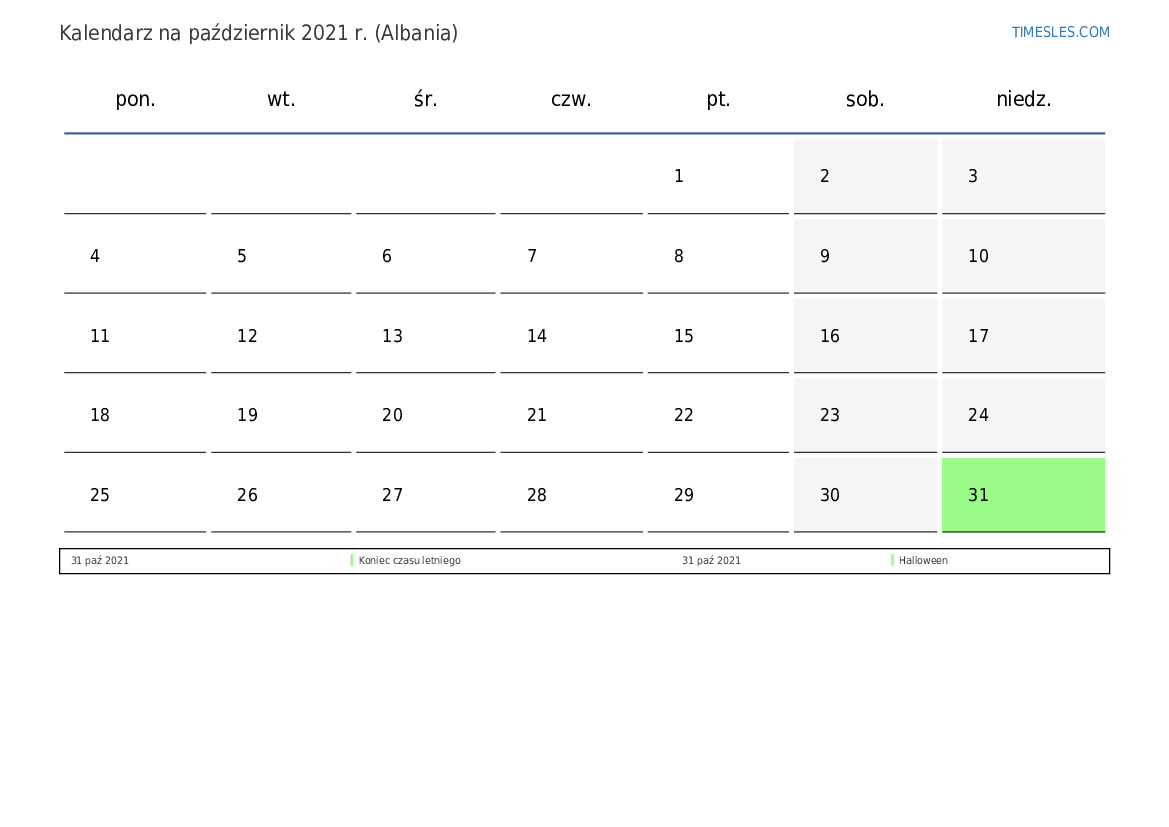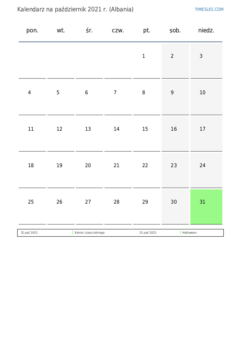 Pobierz i wydrukuj kalendarz PDF ze świętami i weekendami na październik 2021 r. dla Albanii